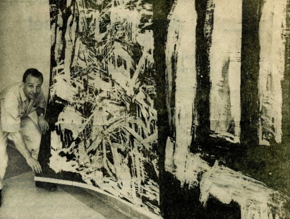 Der Düsseldorfer Andreas Rosenthal beim Aufhängen zweier großformatiger Wachs-Schabebilder „Adler“ und „Raum“ (rechts) in der Galerie am Theater. Foto: Kögler