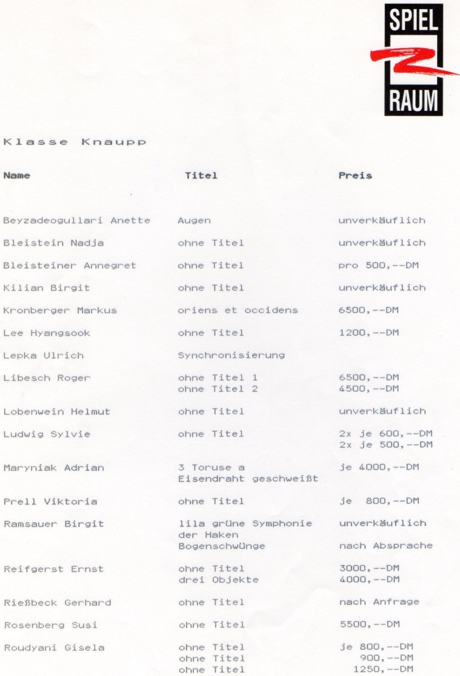 Anette Beyzadeogullari Nadja Bleistein Annegret Bleisteiner Birgit Kilian Werner Knaupp Markus Kronberger Hyangsook Lee Ulrich Lepka Roger Libesch Helmut Lobenwein Sylvie Ludwig Adrian Mayniak Anders Möhl Viktoria Prell Birgit Ramsauer Ernst Reifgerst Gerhard Rießbeck Susi Rosenberg Gisela Roudyani Susanna Rürup Michael Schneider Christiane Spahl