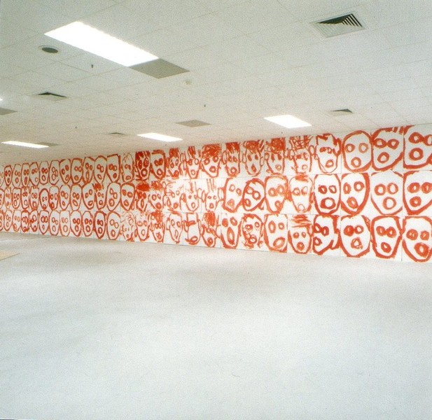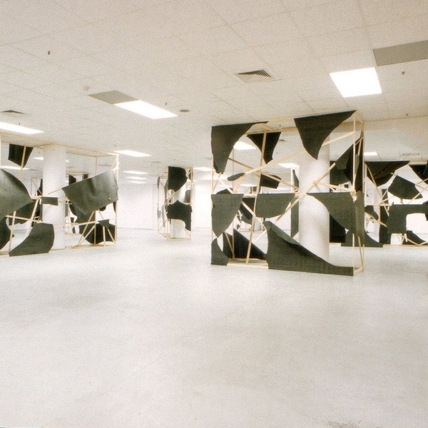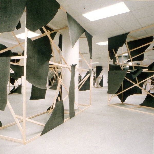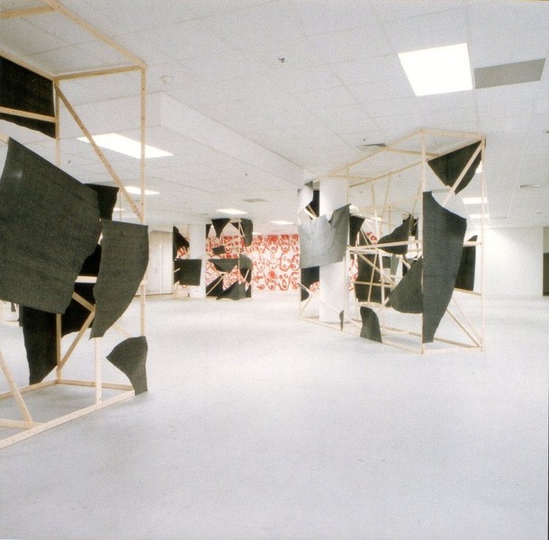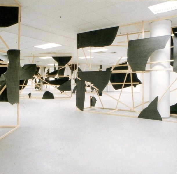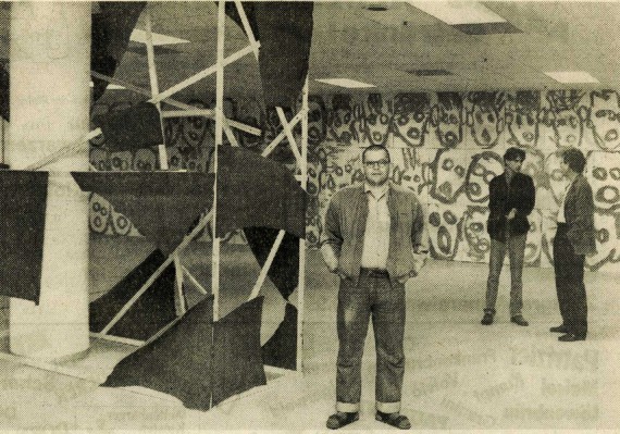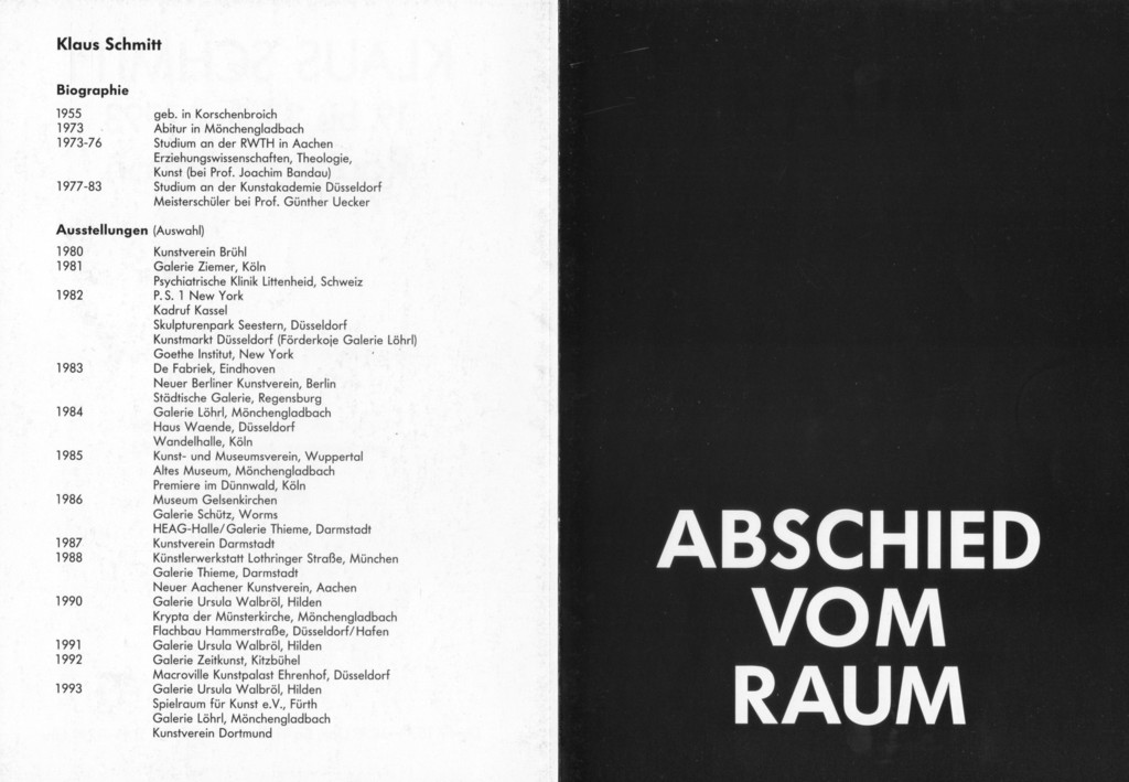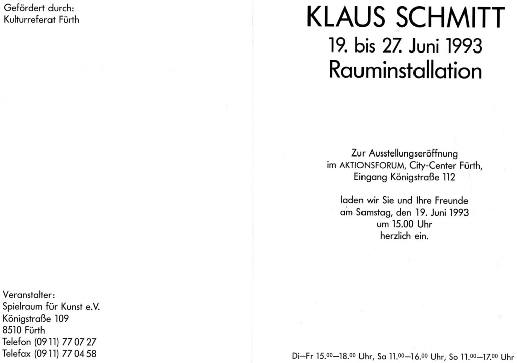 Von Kunstbanausen unbehelligt konnte dagegen der Mönchengladbacher Minimal-Artist Klaus Schmitt das Aktionsforum im City-Center-Basement (Eingang Königstraße) seit Montag in einen Erlebnisraum verwandeln. Aus Holzlatten und Teerpappe baute er neun raumhohe Gerüste, mit denen er die Säulen verkleidet hat. Formal handelt es sich um Bruchstücke eines aufgesprengten diagonalen Kreuzes, die dem Betrachter je nach Standort ein anderes Raumgefühl vermitteln.