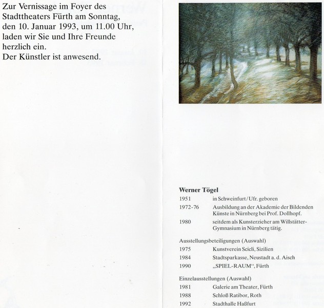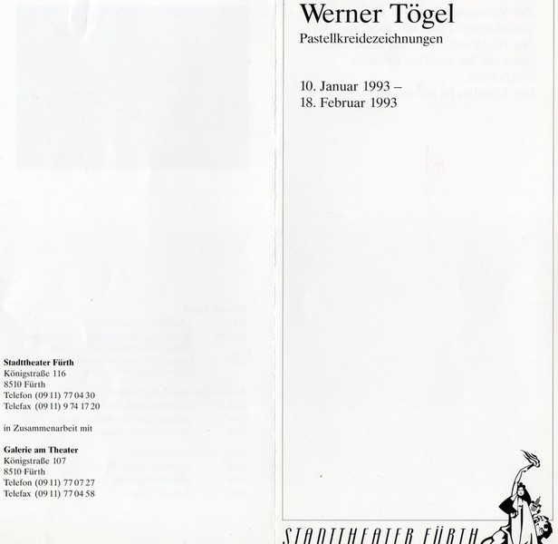 Werner Tögel, Protegé der untergegangenen Galerie am Theater und Funktionär in deren Nachfolgeorganisation „Spielraum für Kunst“, ist in Fürth längst kein Unbekannter mehr. Bereits seit über einem Jahrzehnt mischt er im Ausstellungsgeschehen mit. In seiner neuen Einzelausstellung zeigt er dem Betrachter Wege zur Aussöhnung mit einer dem Verfall preisgegebenen Umgebung auf.
