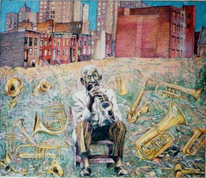 Auftakt zum Aufleben: Der Jazz tröstet die Schwarzen in Werner Tögels Bildern über ihre sozialen Dramen hinweg. ©Foto: Hans-Joachim Winckler