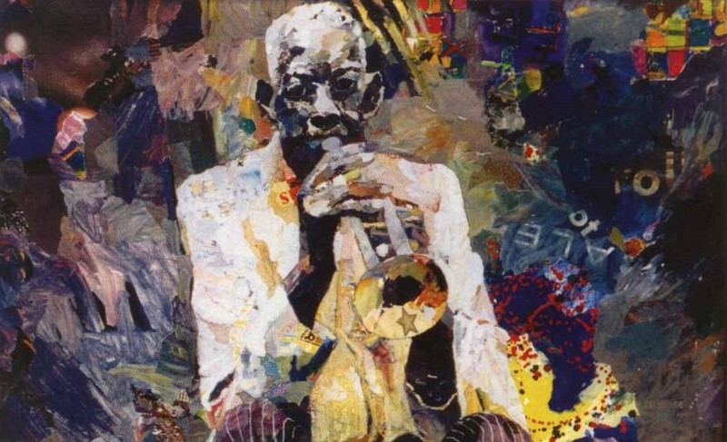Auf großformatigen Leinwänden sind neben den ländlich-naturalistischen Szenen mit Landschaften und Häusern auch Jazzmusiker zu sehen. Der Künstler will auf die
