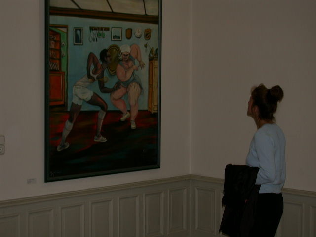 schmächtigen schwarzen Mann. Die Frau lacht den Mann herausfordernd an. Ein ungleiches Paar, über das man schmunzeln kann. -Geht das zusammen? Der kenianische Maler Richard Onyango hat in diesen und