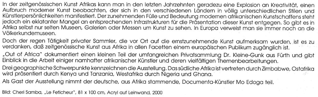 viel zu wenig. Im Unterschied zu früheren, noch in Stammesgemeinschaften beheimateten Künstlergenerationen zeichnen sich Afrikas Künstler heute durch ein Bewusstsein für Individualität und