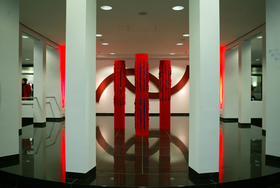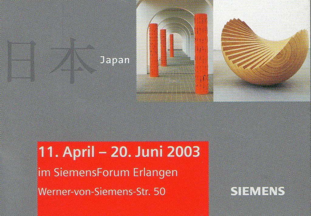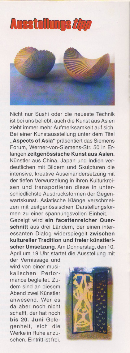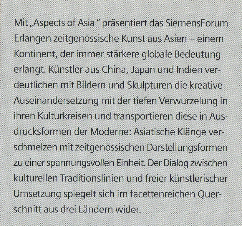 Mit "Aspects of Asia " präsentierte das SiemensForum Erlangen zeitgenössische Kunst aus Asien - einem Kontinent, der immer stärkere globale Bedeutung erlangt. Künstler aus China, Japan und Indien verdeutlichen mit Bildern und Skulpturen die intensive, kreative Auseinandersetzung mit der tiefen Verwurzelung in ihren Kulturkreisen und transportieren diese in unterschiedlichste Ausdrucksformen der Gegenwartskunst. Jeder Künstler hat sein persönliches künstlerisches Vokabular, mit dem er die eigene Identität behauptet und zugleich Zeichen für neue Aussagen setzt - asiatische Klänge verschmelzen mit zeitgenössischen Darstellungsformen zu einer spannungsvollen Einheit. Der Dialog zwischen kulturellen Traditionslinien und freier künstlerischer Umsetzung spiegelt sich in dem facettenreichen Querschnitt aus drei Ländern wider:
