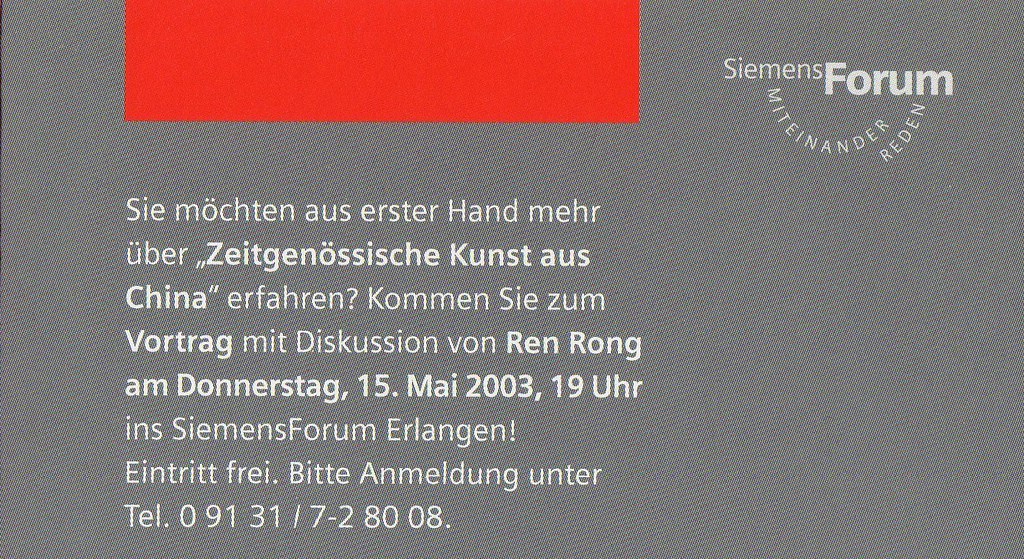 Der chinesische Künstler Ren Rong lebt und arbeitet seit 1986 in Bonn und Peking. Sein Werk hat durch zahlreiche Einzel- und Gruppenausstellungen die Aufmerksamkeit eines breiten Publikums und die hohe Wertschätzung in Fachkreisen gewonnen.