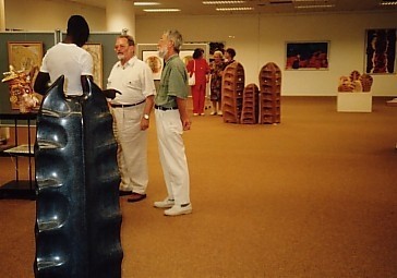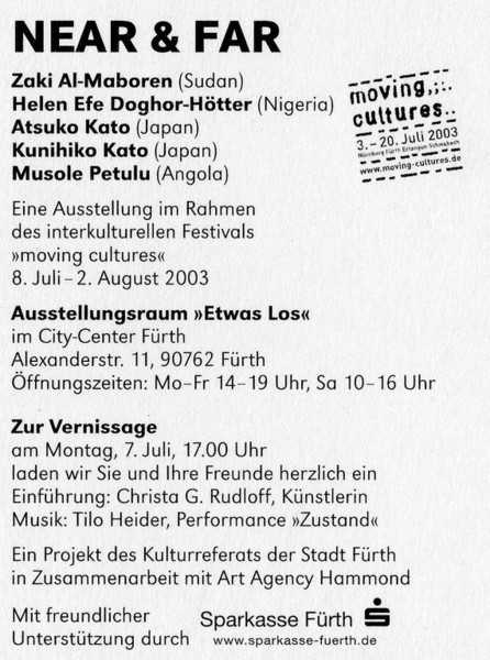 Hammond: „Seine Arbeiten haben nicht nur Qualität, sondern auch das gewisse Etwas.“ Petulu, 1965 in Angola geboren, war als Stipendiat nach Deutschland gekommen; bei Grundig lernte er Elektroniker, vor zwei Jahren nahm er beim Kunstpreis der Nürnberger Nachrichten teil, wo er prompt einen Anerkennungspreis erhielt. Seit 1997 arbeitet er an der Scharrerschule in Nürnberg und gibt dort kreativen Kunstunterricht in den fünften und sechsten Klassen. Dass Petulu nun einer de fünf Künstler ist, die das Fürther „Moving-Cultures“-Festival-Projekt „Near & Far“ im „Etwas los“-Raum des City-Centers bestücken und bereichern, dürfte als weiterer Markstein seiner Künstlerbiografie gelten.