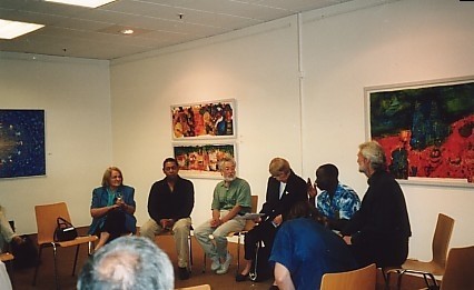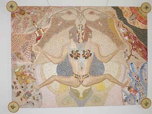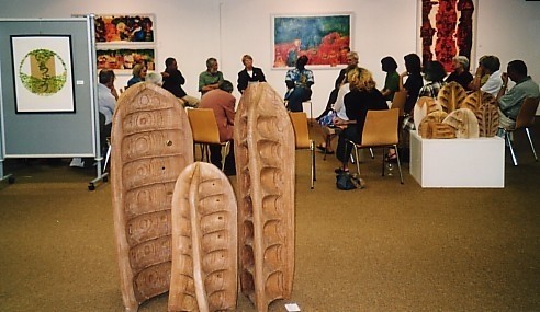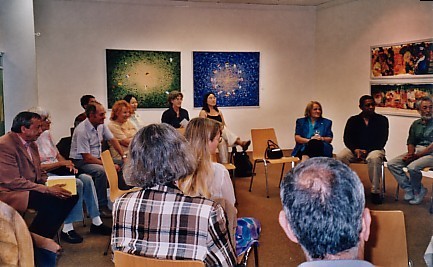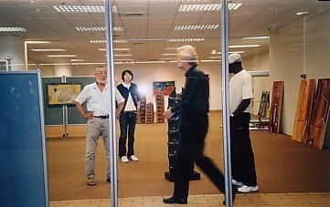 Das „gewisse Etwas“ teilt sich dem Besucher beim Grossteil der neun Arbeiten mit, die zwischen 1996 und 2003 entstanden sind. Darunter ist jene „Mystische Welt“ betitelte Ideenexplosion, für die Petulu den Anerkennungspreis einheimste. Souverän kombiniert er den Stil der traditionellen afrikanischen Malerei mit Anleihen beim Zeitgeist. Punktmalerei, die bis in feinste Ziselierungen ausgetüftelt ist, trifft auf collageartig integrierte Objekte und Gegenstände. Da ist, plastisch aus der Holzplatte ragend, ein Grab zu sehen, ein Raketenfahrzeug, ein Mensch in einem Boot. An welchem Werk wäre besser abzulesen, was „Moving Cultures“ intendiert, nämlich die Spuren aufzuzeigen, die die Begegnung von Künstlern aus ferneren Kulturkreisen mit de hiesigen Lebens- und Arbeitswelt hinterlassen?