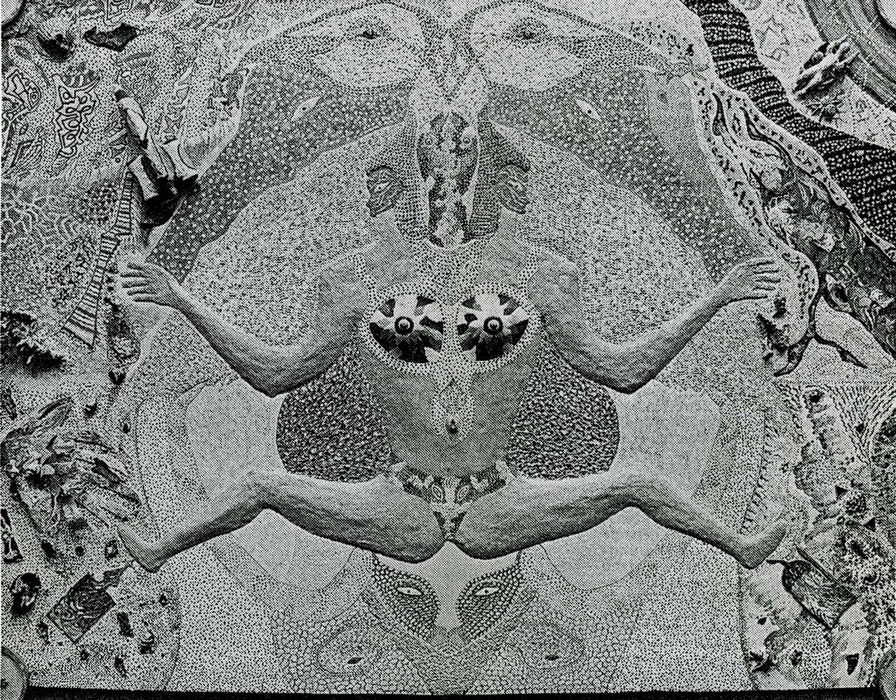 Das wäre womöglich grusliger Kitsch, gelänge Petulu nicht das Kunststück, zwischen dezenter Farbgebung und blühender Ikonografie die Waage zu halten und ein einheitliches Ganzes zu schaffen, ein Gesamt-Kunstwerk aus der Summe faszinierender Details. Monate braucht Petulu für derlei Arbeiten. Über ein Jahr hat er investiert in die wabernde Flora und Fauna in „Musoles Welt“; unverkäuflich ist das Werk, zugleich das älteste seiner „Near & Far“-Exponate. Dass er wieder den Weg findet zum punktmalerischen Mystizismus und zur subtilen Masken- und Geisterschau, ist ihm zu wünschen in Anbetracht der neueren und neuesten, deutlich kraftloser und gefälliger geratenen Flirts mit dem allzu Plakativen.