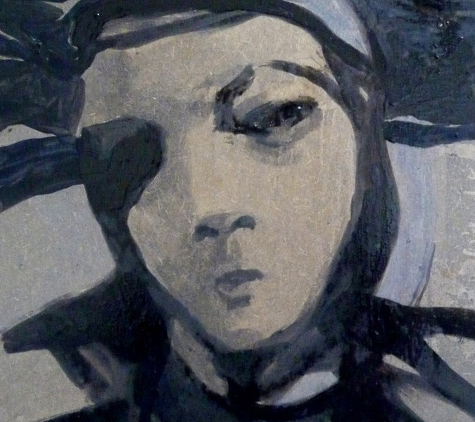 Fatma Güdü skizziert im Gegensatz zu ihrem Kollegen ihre Figuren grob und flüchtig. Die Künstlerin, Jahrgang 1983, lebt in Fürth und studiert seit 2006 Freie Malerei. Mit wenigen Pinselstrichen charakterisiert sie das Gesicht einer Frau. Nur die Köpfe der Personen sind auch bei einem anderen Bild der jungen Malerin ausgearbeitet, die Körper und der Hintergrund verschwinden in finsterem Schwarz. Alles konzentriert sich auf die Gesichter, die großen Schmerz ausdrücken. Packend!