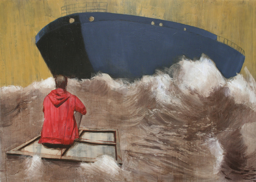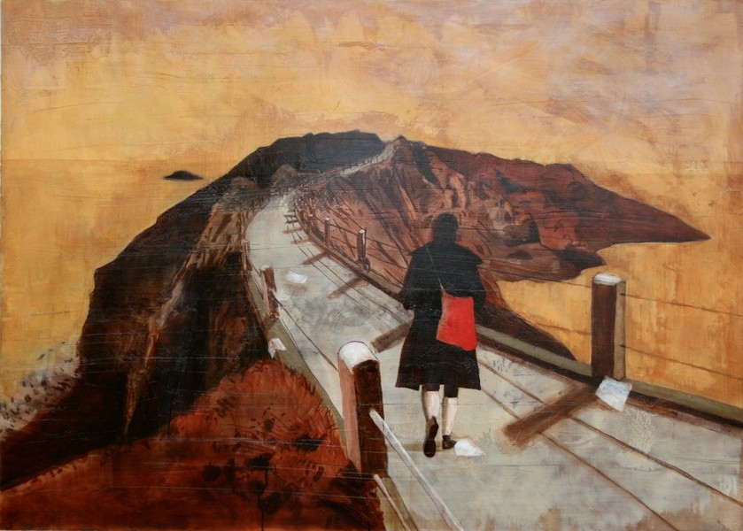 Michael Hottners Arbeiten dagegen wirken, zumindest oberflächlich betrachtet, vergleichsweise heiter. Er setzt auf die Wirkung lasierender Farbschichten mit durchschimmernder Zeichnung, so auch bei der großformatigen Landschaft «Sark«. Zwar sieht man hier die typische Postkartenansicht mit der sich dynamisch über die zerklüfteten Felsen schwingenden Straße, doch die grundgute Stimmung trügt. Zwar ist der Himmel in ein wunderbares, warmes Licht getaucht, das verlockend leuchtet, aber die dunklen, schroffen Felsen wirken bedrohlich; der Mensch, der die Straße entlang schreitet, ist einsam.