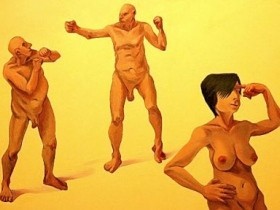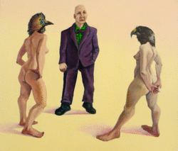 Der Titel des Gemäldes spricht Bände. «Was vor uns liegt, liegt hinter uns» war bis Sonntagmittag im Foyer des Stadttheaters zu sehen. Dann griffen Kunstmanager John Hammond und eine Mitarbeiterin zu. Zwei weitere Arbeiten des gebürtigen Fürthers Rubin Hirschbeck gingen ebenfalls zurück ins Depot. Alle drei Werke zeigen ausnahmslos nackte Menschen. Eine hagere Frau mit rotem Kopftuch reitet auf dem Rücken eines älteren Mannes; vor dem Paar kriecht ein weiterer Mann, rechts erkennt der Betrachter den Rumpf einer Frau. «Drei Frauen auf drei Beinen» zeigt eine Liegende, deren Brüste zu erkennen sind, eine Frau von vorn, eine von hinten. In «Die alten Männer» beharken sich zwei Greise im Faustkampf, eine Frau geht, sich an die Stirn tippend, vorbei.