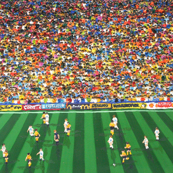 die Herzen eingefleischter Kleeblättler höher schlagen. Wunderbar bunt, fröhlich und hemmungslos körperhaft wird die Farbe selbst zum gestalterischen Element und lässt ein Fußballstadion entstehen,