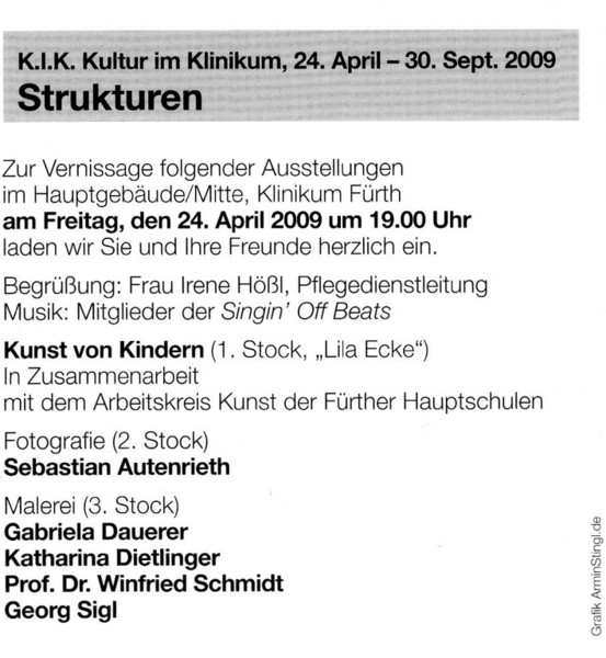 zeigen derzeit renommierte, aber auch aufstrebende junge Künstler sowie der Arbeitskreis Kunst der Fürther Hauptschulen, was ihnen zum Thema «Strukturen« eingefallen ist. Malerei, Fotografie und