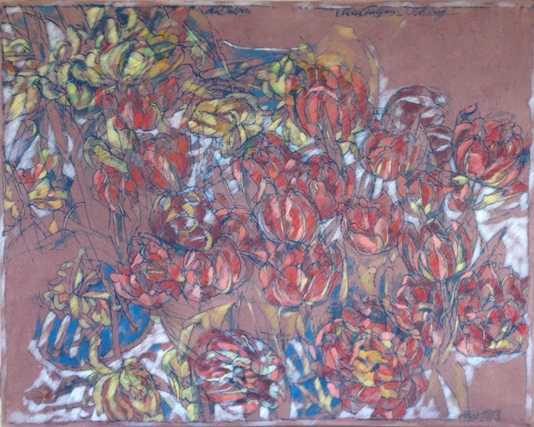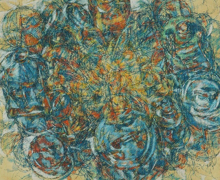 Er arbeitete, so lange wie er eben brauchte. Das Ergebnis sind poetische Abstraktionen, stark rhythmisiert, als wehe eine Äthermelodie hindurch, und von eigentümlicher Fröhlichkeit, die jetzt in der Sparkasse zu sehen sind. Vieles wirkt ornamental. Blumen geraten zu einer Art Schmuckband. Was den Farbkreiseln zugrunde liegt, ist erst auf den zweiten Blick erkennbar.