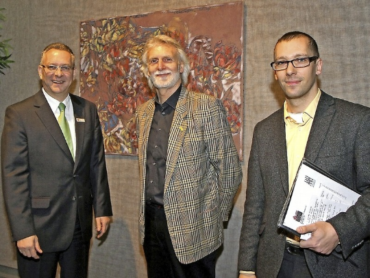 Leise Bilder: Sparkassenvorstand Hans Wölfel, Galerist John Hammond und Künstler André Debus (v.l.) bei der Eröffnung der Häring-Ausstellung. © Bartmann