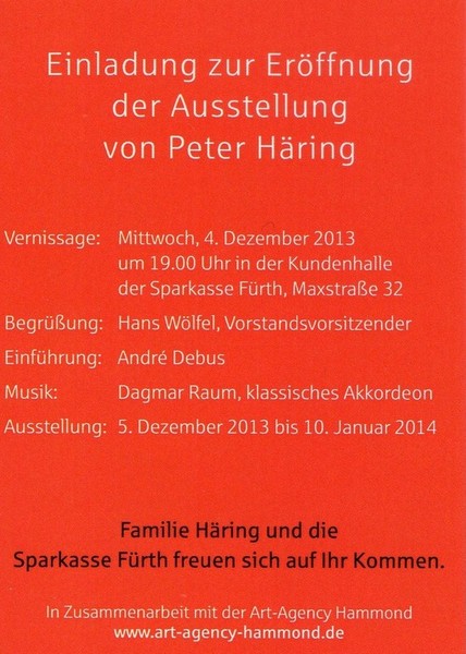 FÜRTH - Arbeiten des 2011 verstorbenen Fürther Künstlers Peter Häring zeigt aktuell Johnn Hammonds Art-Agency in der Sparkasse Fürth.