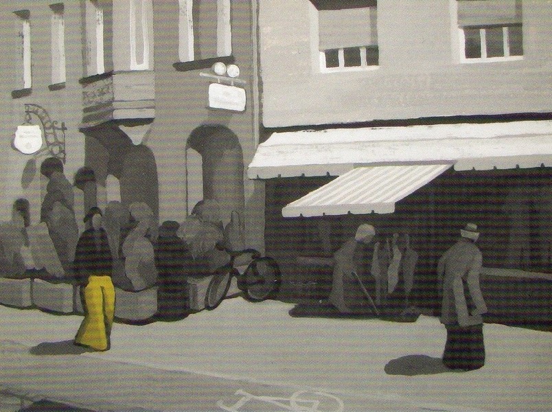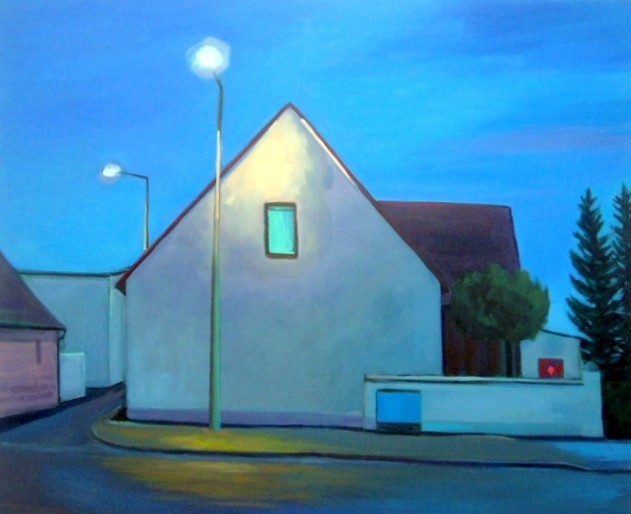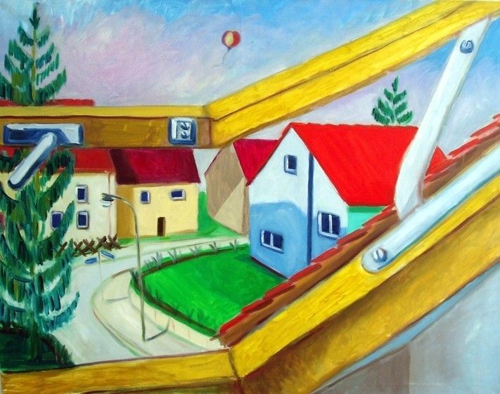 Vorstadtsiedlung, in der das Leben wie erstarrt scheint. Ein Ball auf dem Gehsteig wirft die Frage nach dem Verbleib der Kinder auf; eine Hausfassade, von der Giebelseite betrachtet, erfährt eine
