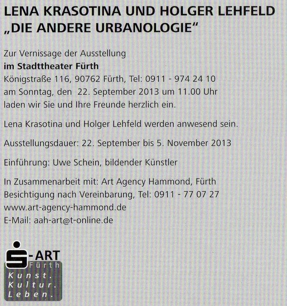 FÜRTH - Zum Auftakt der Saison 2013/14 schmückt sich das Foyer des Stadttheaters mit den Werken zweier Künstler, präsentiert von Johan Hammonds Art-Agency. Gemeinsames Thema aus deutscher und russischer Sicht: „Die andere Urbanologie".