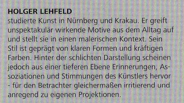 Wenn dem so wäre, dann läge Holger Lehfeld im Alkoholkoma. Seine Bilder von Nürnberg strotzen nur so vor Farbigkeit und strahlen dennoch irritierende Kühle aus. Lehfelds Lieblingsschauplatz ist die