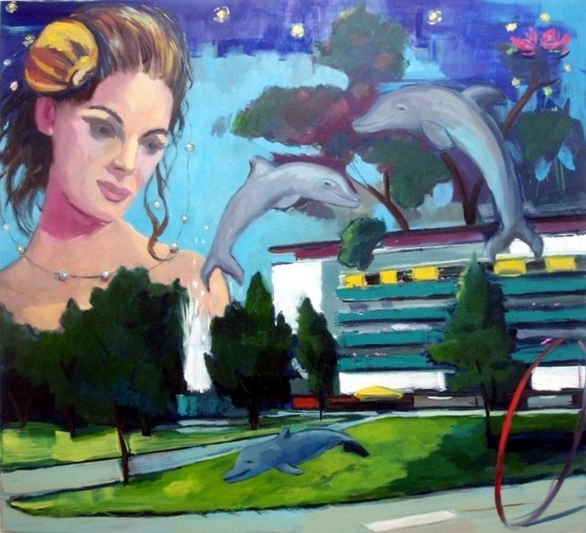sich drei Delfine vor einem Wohnblock, wachsen Bäume aus dem Dach, blickt eine Meeresgöttin mit nassem Haar über den Horizont. Ein surreal-fantastisches Pendant zu Lena Krasotinas „Rotem