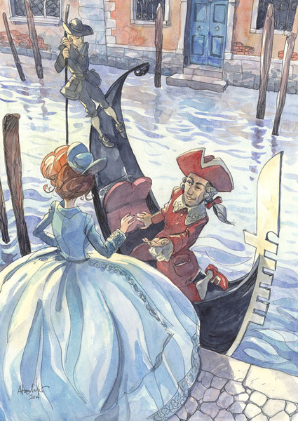 Italien steht Venedig im Fokus, aber auch Casanova persönlich. Atzenhofer hat die Erinnerungen des amourösen Helden mit einem Augenzwinkern gemalt: Er lässt ihn hinter einer Perückendame herlaufen,