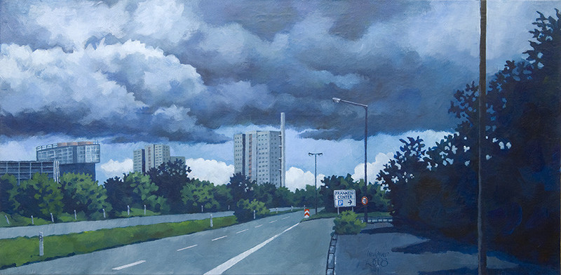 Innenstadt. Ein Bild zeigt im Hintergrund die Frauenkirche am Hauptmarkt. Dann bildet er ungeschminkt das Umland ab: Hochhäuser in Langwasser, Autobahnausfahrten, wie es sie wirklich gibt, den Weg