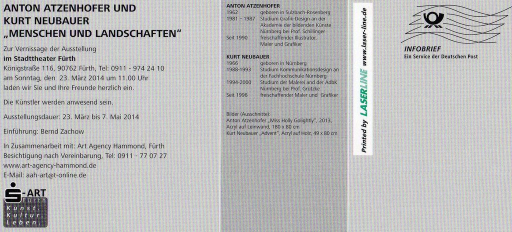 Anton Atzenhofer worked since 1990 as a freelance illustrator, painter and graphic designer but since 2004 Anton Atzenhofer dedicated himself increasingly to free painting and graphics. The communicative exchange with other people through the medium of art is very important to Anton Atzenhofer that is why he and his wife run an art gallery in Nuremberg since 2007.