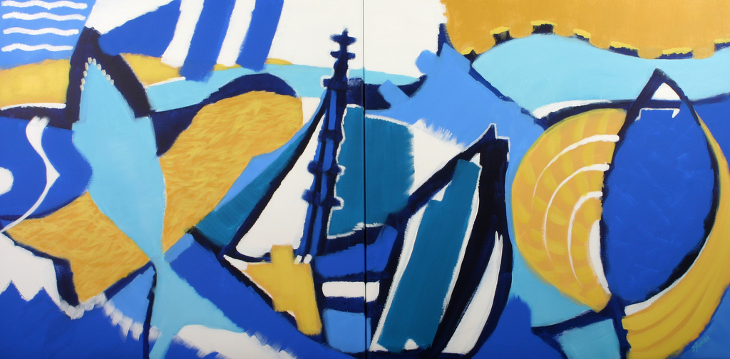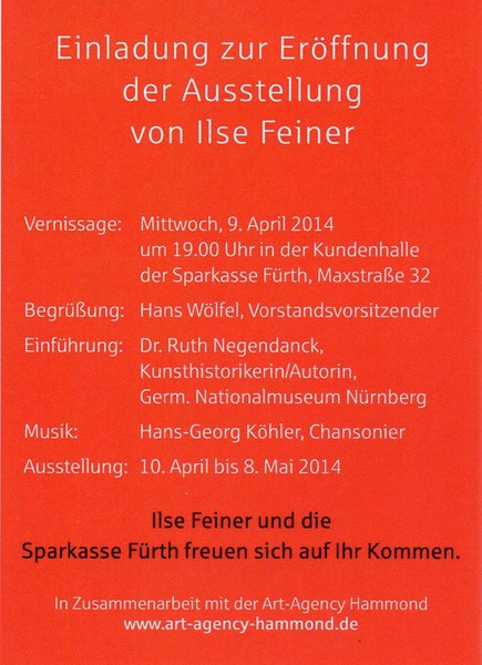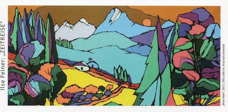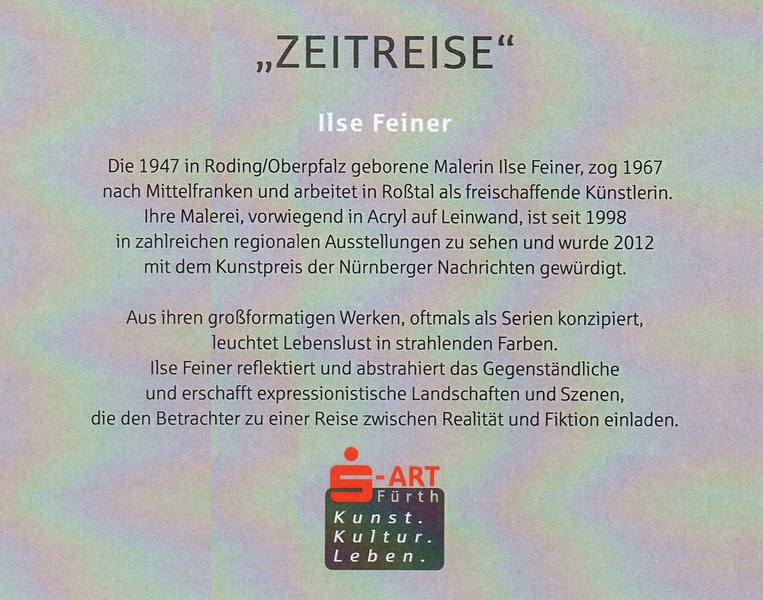 „Zeitreise“ nennt sich Feiners Ausstellung. Zumindest handelt es sich hierbei um eine Reise in die zurückliegenden sieben Schaffensjahre der Künstlerin. Ilse Feiner hatte keine Akademie besucht, ihre berufliche Ausbildung hatte sie am Fürther Finanzamt durchlaufen. Dort hantierte man zwar auch mit Schreibmaschinen in Leuchtorange, Steuerbögen in Lindgrün und Kaffee schwarz oder mit Milch – aber diese Farbspektren waren Ilse Feiner doch zu beengt.