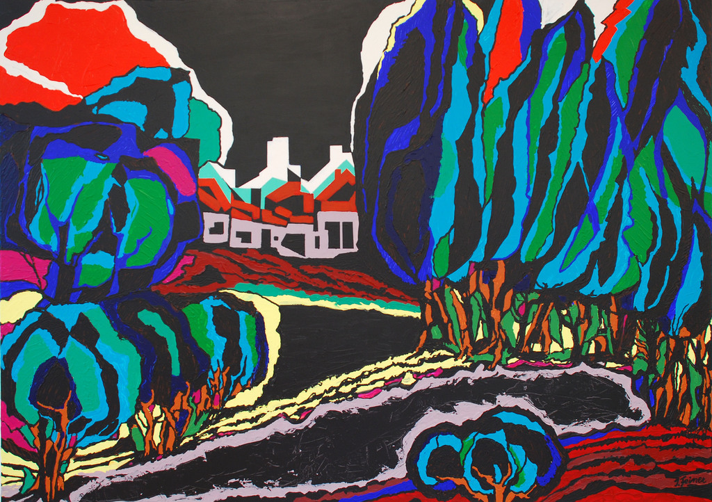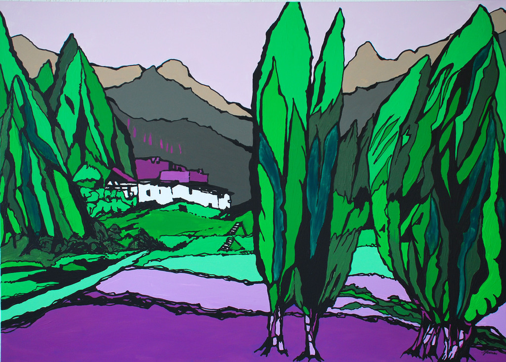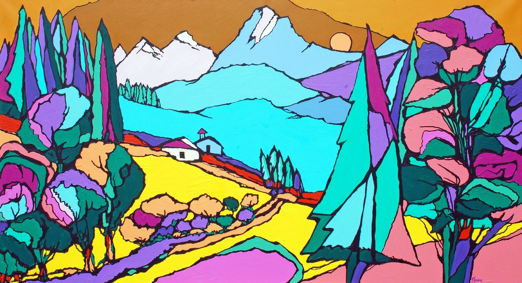 Und die Farben? Leuchtend, mal grell, mal abgemildert, aber immer im bewussten Kontrast zueinander stehend. Und das Beste: Sie haben ihre Plätze getauscht. Da kommt es schon mal vor, dass grüne Zypressen in tiefviolettem Boden wurzeln. Oder dass sanft türkise Bäume mit dem Blau des Gebirges korrespondieren. Dass der Fürther Rathausturm ganz in Weiß in einen grünen Himmel mit blauen Wolken ragt, oder der blaue Turm der Auferstehungskirche zu einem dunkelmauven Himmel strebt.