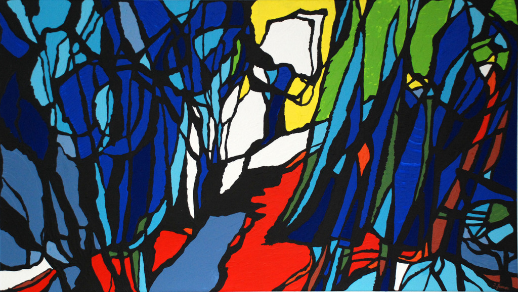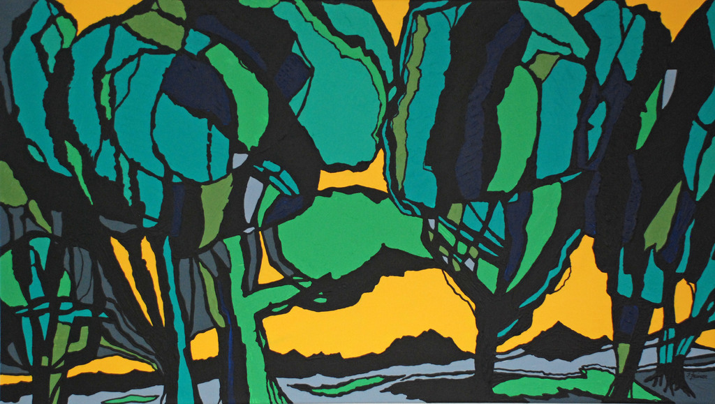 Auch Ilse Feiner pflegt eine Vorliebe für Landschaftsmalerei. Aber keine Vorliebe für den Abbildrealismus. Ihre Botanik und Topographie besteht aus schwarzen Konturen, ein wenig wie die Tuschzeichnungen in Comics, nur kantiger und schroffer.