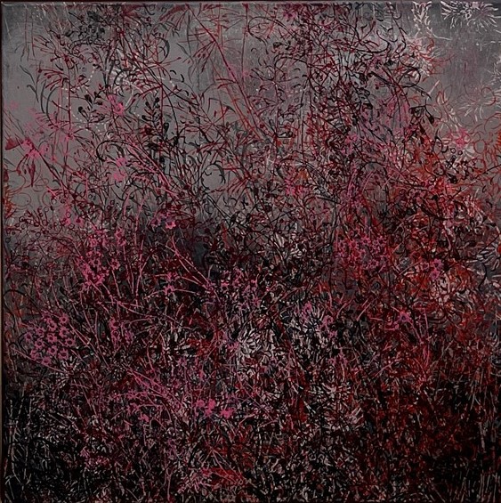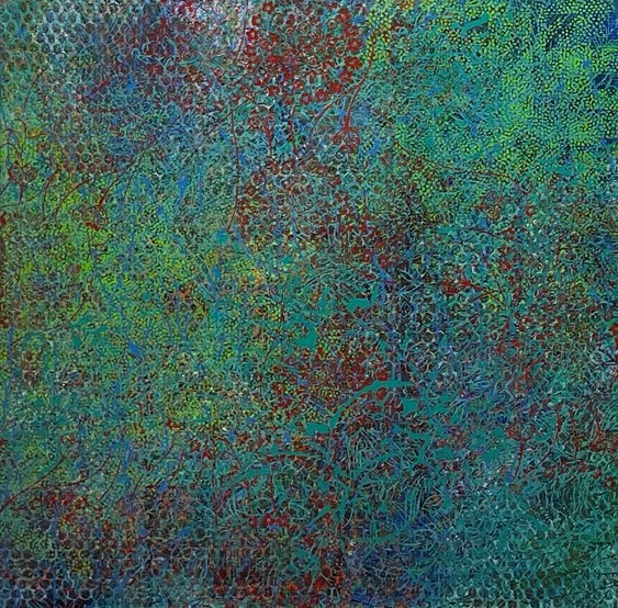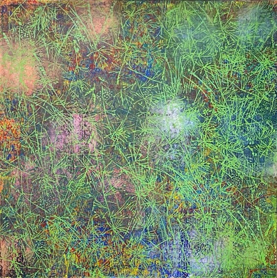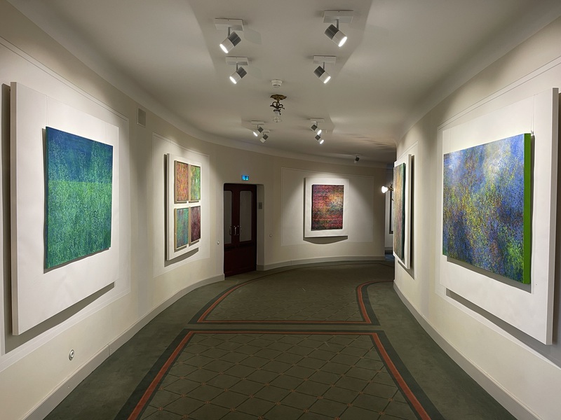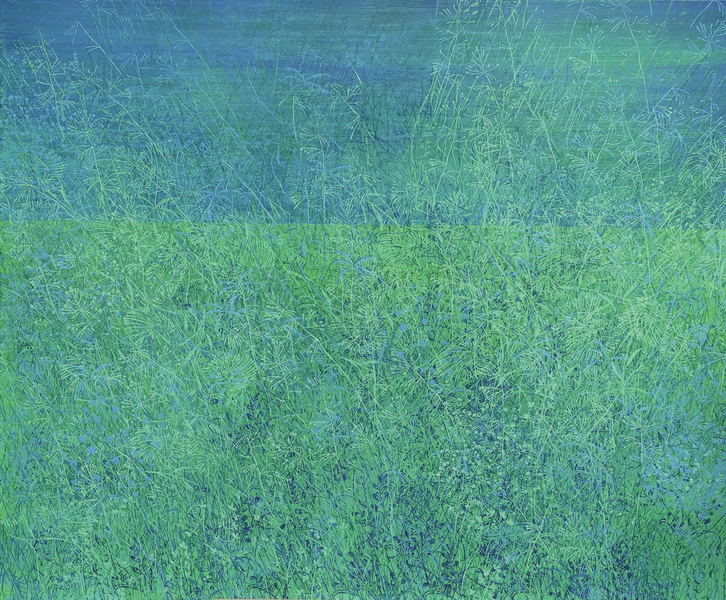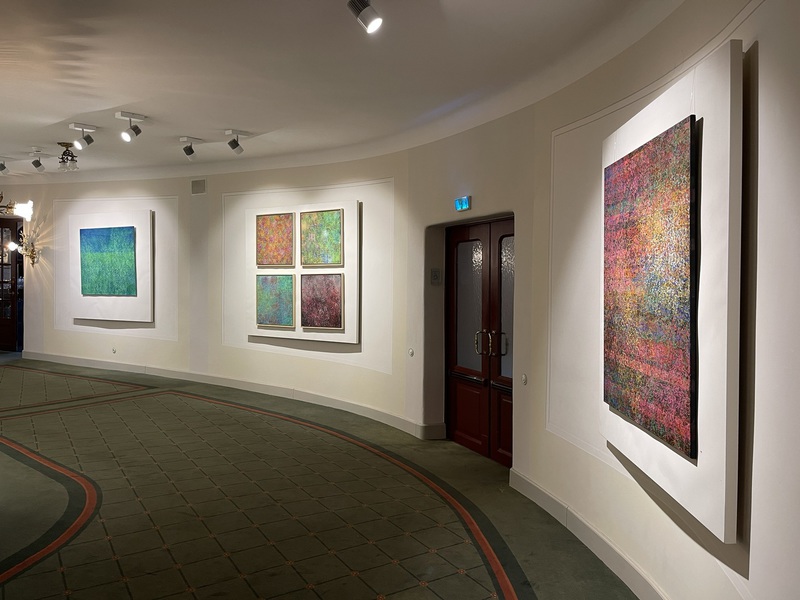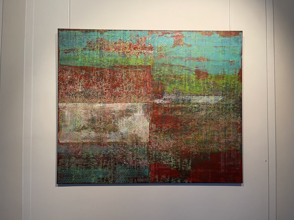 Teresa Wiechova arbeitet in Gouache, mit Walzendruck auf Leinwand oder mixed media auf Canvas. Sie kreiert Strukturen. Jahreszeiten manifestieren sich in Farben, werden zu Wiesen, Gärten, Meeren.