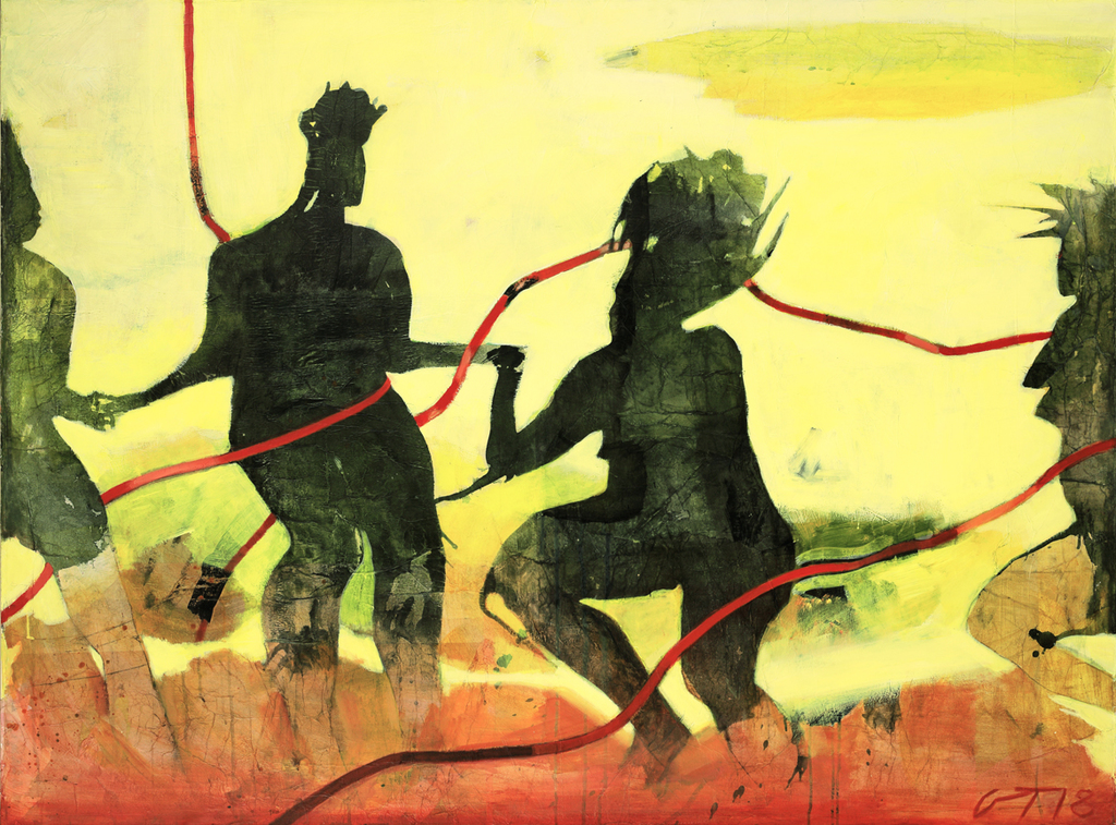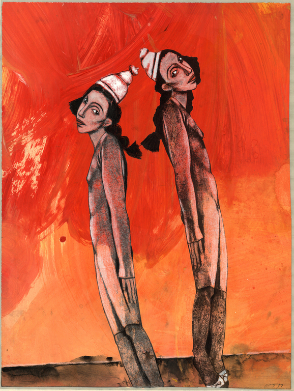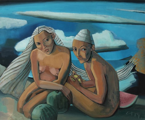 Bei Gudrun Trendafilov dreht sich in Mischtechnik auf Paper und auf Leinwand alles um die Beziehungen zwischen Menschen. Die Köpfe oder Körper sind meist Frauen - und sie stehen mitten im Leben. Hier wird gezweifelt, getröstet, geträumt und gewütet. Die eine Figur bringt Klarheit in ihre Angelegenheiten, eine andere wagt sich aufs Glatteis, die nächste ist ganz in sich versunken.