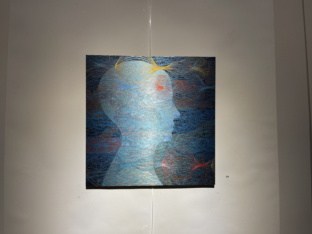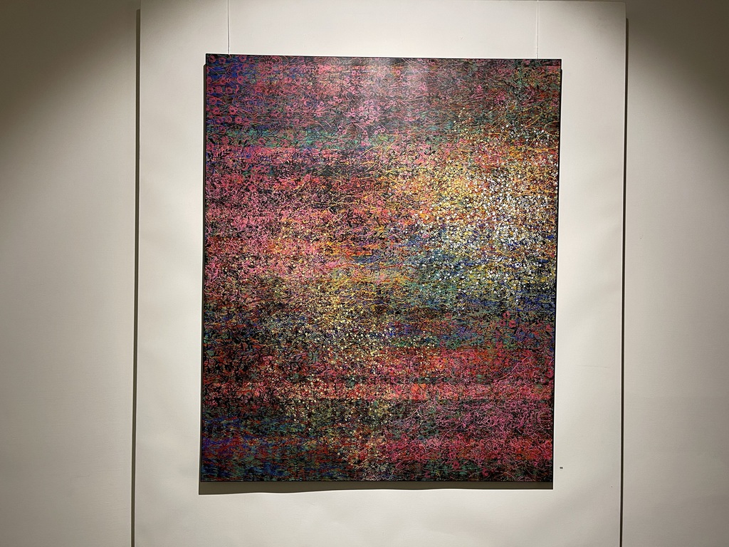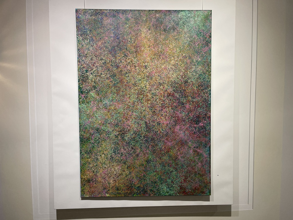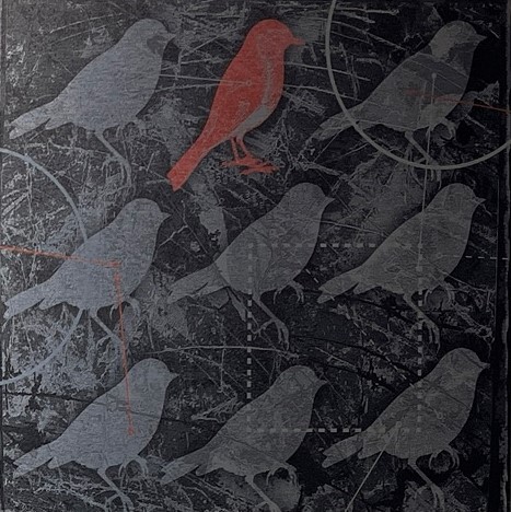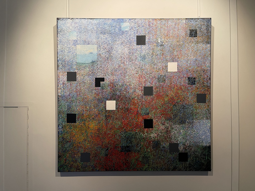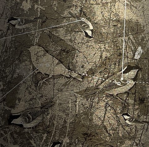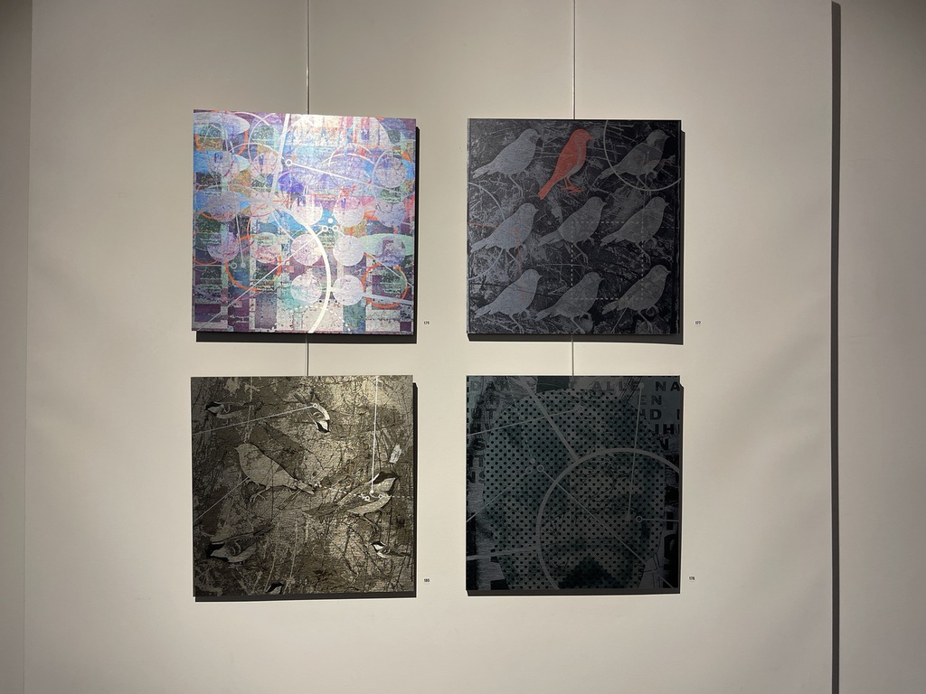 Zwar zeigt sie die Idylle, manchmal aber auch mit Brüchen, zersetzt durch kleine Quadrate, wie ein zersiedeltes Gebiet, in dem Reihenhäuser die Bäume verdrängen. Zu ihrer Technik gehören historische Walzen, mit denen in den 1960ern noch Wände gestrichen wurden, die Wiechova aber als Pinsel einsetzt. Es entstehen Muster, die sich wiederholen, und Arbeiten, die an kostbare Tapeten erinnern, gerne mit Vogel-Motiven.