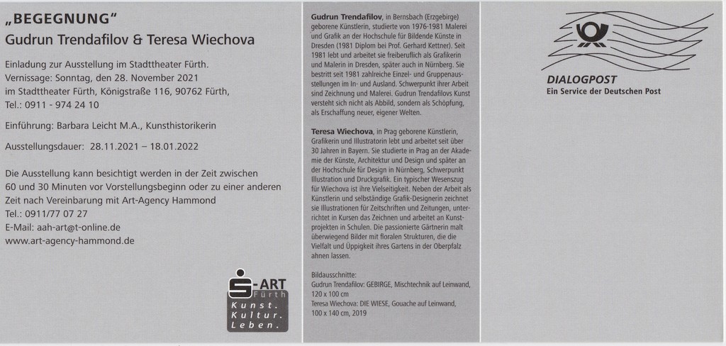 Teresa Wiechova in Prag geborene Künstlerin, Grafikerin und Illustratorin lebt und arbeitet seit über 20 Jahren im Nürnberger Raum. Sie studierte in Prag an der Akademie der Künste, Architektur und Design und später an der Hochschule für Design in Nürnberg, Schwerpunkt Illustration und Druckgrafik. Ein typischer Wesenszug für Wiechova ist ihre Vielseitigkeit. Neben der Arbeit als Künstlerin und selbständige Grafik-Designerin zeichnet sie Illustrationen für Zeitschriften und Zeitungen, unterrichtet in Kursen das Zeichnen und arbeitet an Kunstprojekten in Schulen.