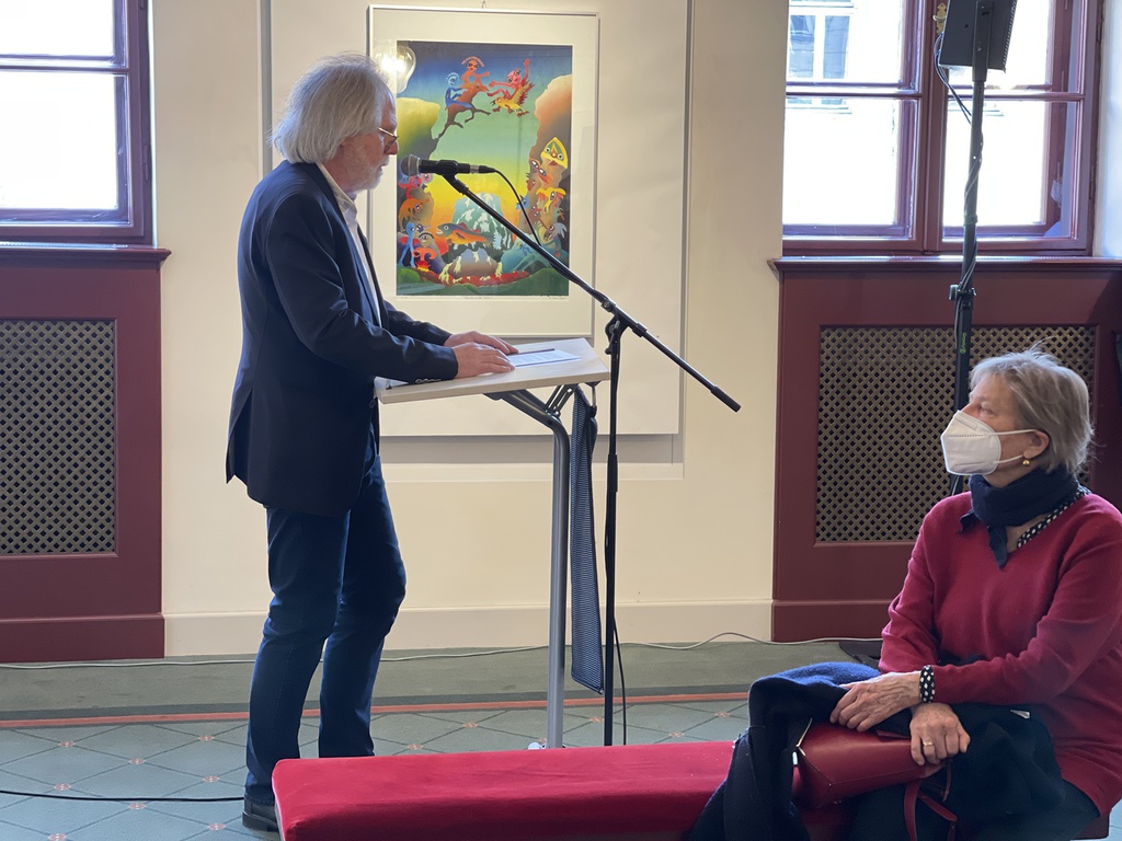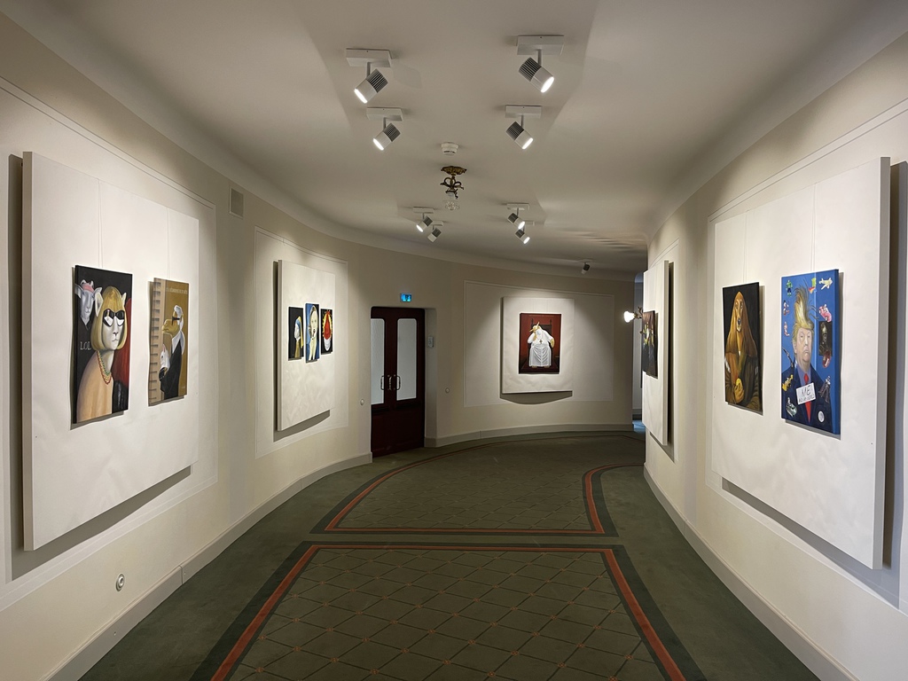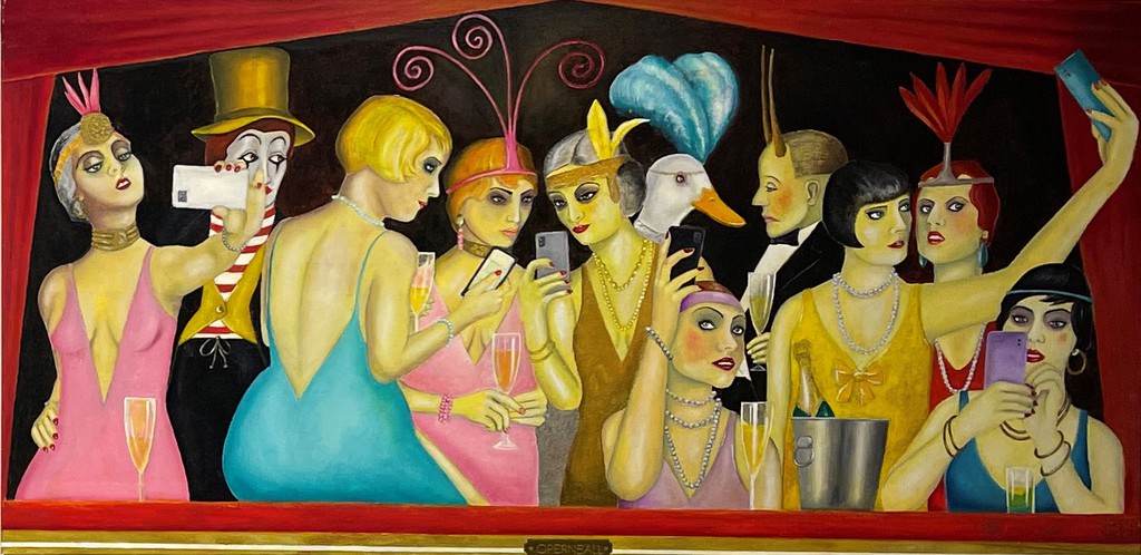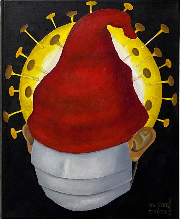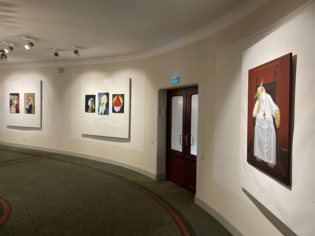 "Eigenwillige Satiren" sind Reinhard Schlüters Gemälde. Der 1948 geborene Bauingenieur, der mit der Österreicherin Maresy verheiratet war, deren Werk momentan im Fokus eines neuen Projekts in der Auferstehungskirche über (größtenteils vergessene) Fürther Künstlerinnen steht, ist ein Autor und Maler, der unter anderem für den Bayerischen Rundfunk arbeitete und Cartoons zeichnete. In den Bildern seiner aktuellen Ausstellung gehen künstlerisches Zitat und Verfremdung eine Verbindung ein.
