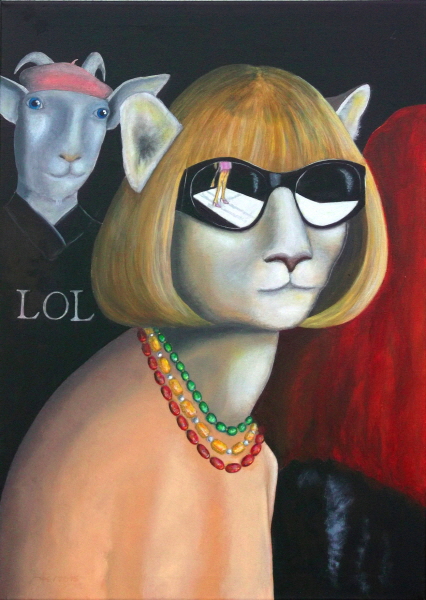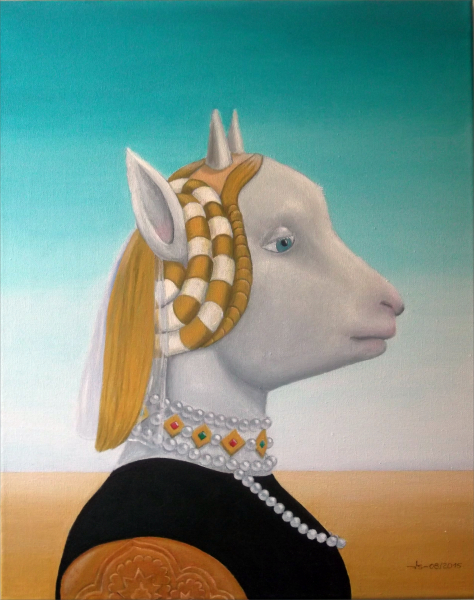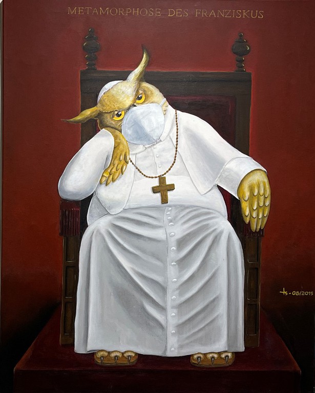 Papst Franziskus etwa sitzt auf dem Stuhl Petri, genervt oder ermüdet, man weiß es nicht genau, den Kopf hat er seitlich aufgestützt - nur ist es ein Uhu, der da in weißem Ornat zu sehen ist. Albrecht Dürer wird in seinem berühmten Selbstportrait gezeigt; seine langen Haare sind aber die Ohren des irischen Setters, der ihn darstellt, und als Vermeers "Mädchen mit dem Perlenohrring" blickt ein Lamm nachdenklich in die Ferne.
