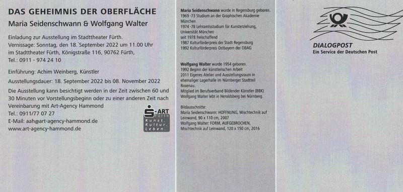 Dem Galerist John Hammond ist hier eine großartige Ausstellung gelungen. Mit Maria Seidenschwann und Wolfgang Walter bringt er zwei Künstlerpositionen in einen spannenden Dialog, die vieles gemeinsam haben, und doch gleichzeitig sehr verschieden sind.