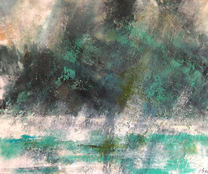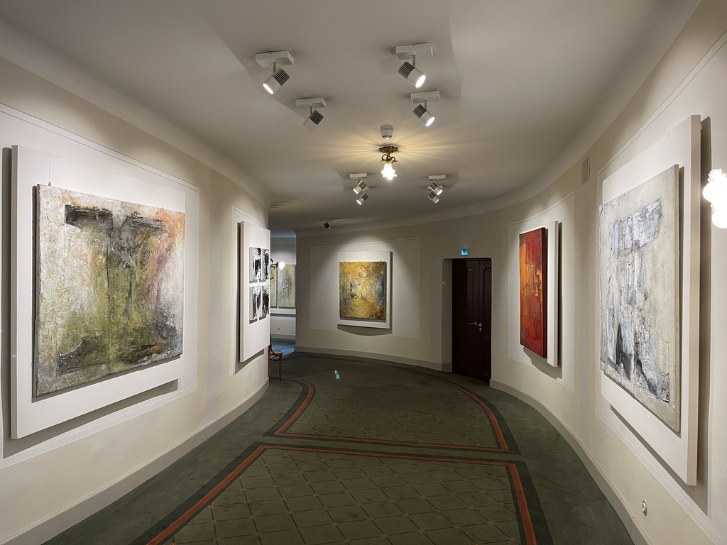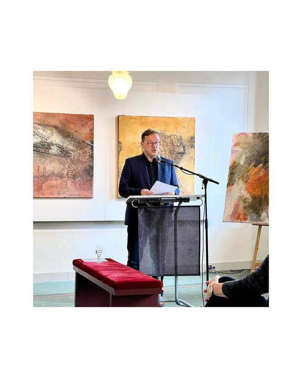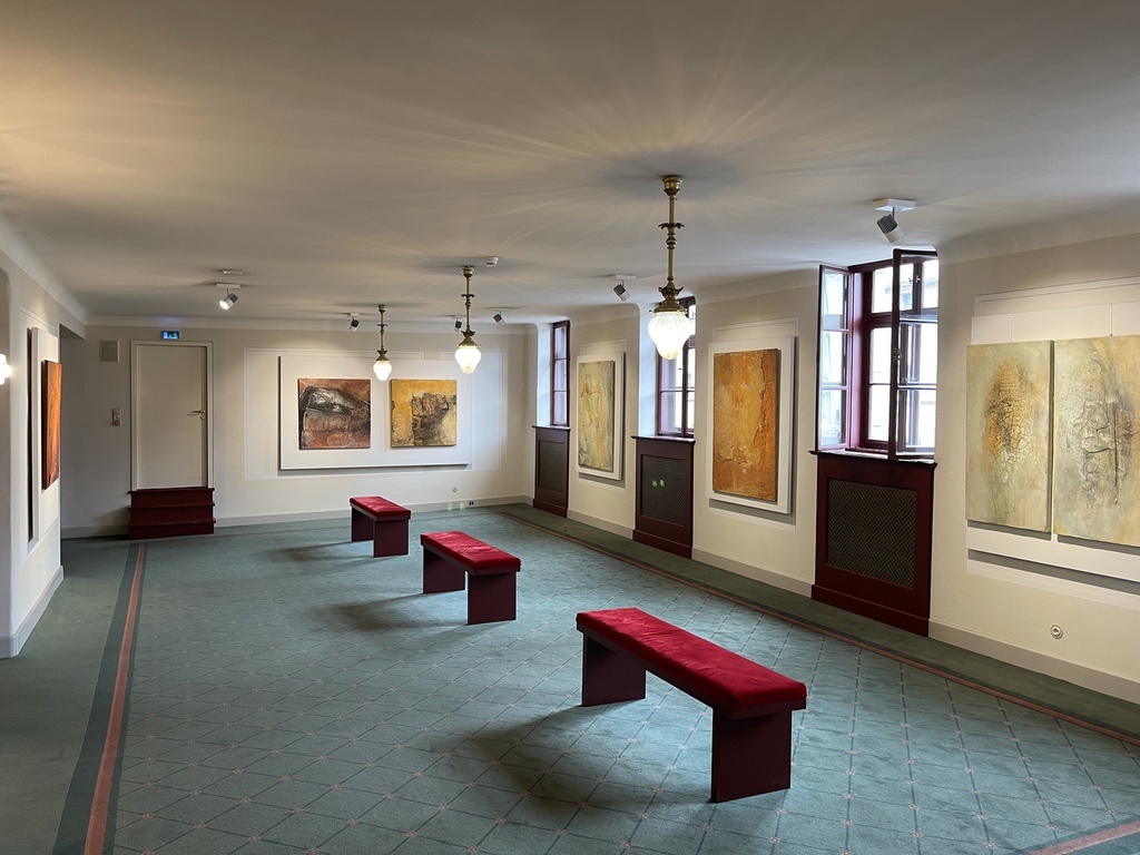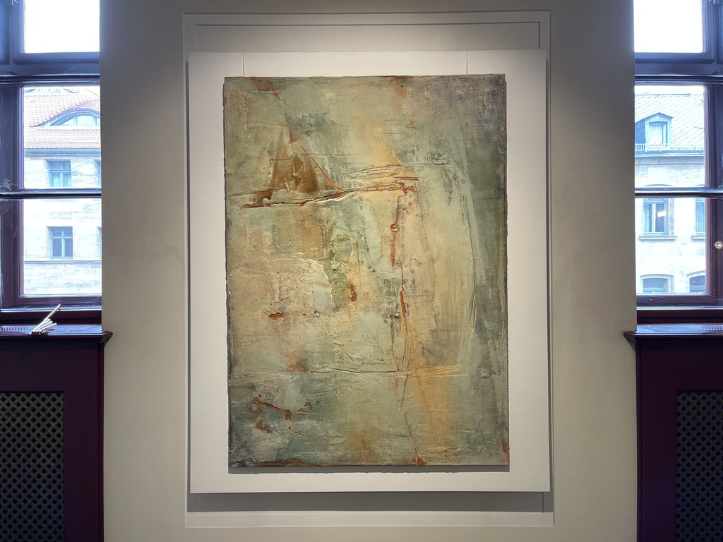 Ich möchte Sie deshalb einladen, ganz nah an die Bilder heranzutreten. Im Gegensatz zu den großen Museen, können Sie das hier tun, ohne gleich einen lautstarken Alarm auszulösen. Nutzen Sie also die Chance und lassen Sie Ihren Blick über die Oberflächen gleiten. Lassen Sie sich überraschen von all den Strukturen, Schichten und Überlagerungen. Von reliefartigen Erhöhungen, von Bergen und Tälern, Schluchten und Seen. Von Spuren, Kratzern, Verletzungen. Von überraschenden Farbwechseln. Und wechseln Sie dann wieder in die Fernsicht und genießen Sie die Komposition als Ganzes, den Farbklang, Ruhe und Dynamik.