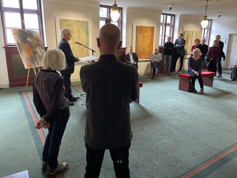 Und ich möchte Sie beglückwünschen, dass Sie den Weg hierher unternommen haben, um diese Bilder im Original zu erleben. In Zeiten von Digitalisierung, Medienkonsum und Bilderflut mutet es ja schon beinahe anachronistisch an, sich an einen Ort zu bewegen, um handgemachte Bilder zu betrachten, ganz ohne Touchscreen, ohne App und Elektronik. Deshalb möchte ich Ihnen auch empfehlen: Handys erstmal in der Tasche lassen und schauen, genau hinschauen. – Aus meiner Sicht ist dieses „Vor-dem-Original-Erlebnis“ sehr wertvoll und unersetzlich.