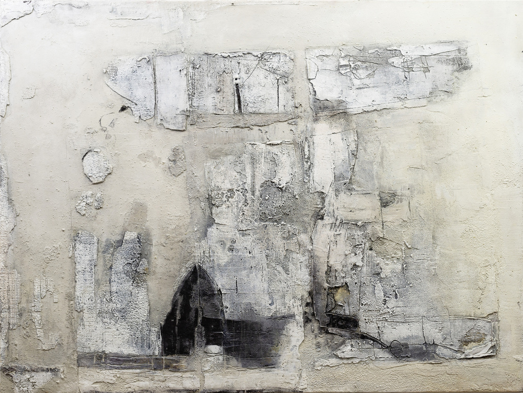 weißer Farbe übermalt. Dabei lässt sie aber das Vorherige durchschimmern und holt nun darunterlegende Schichten durch Schaben, Kratzen oder den Einsatz von Terpentinlösung in Teilen wieder hervor.
