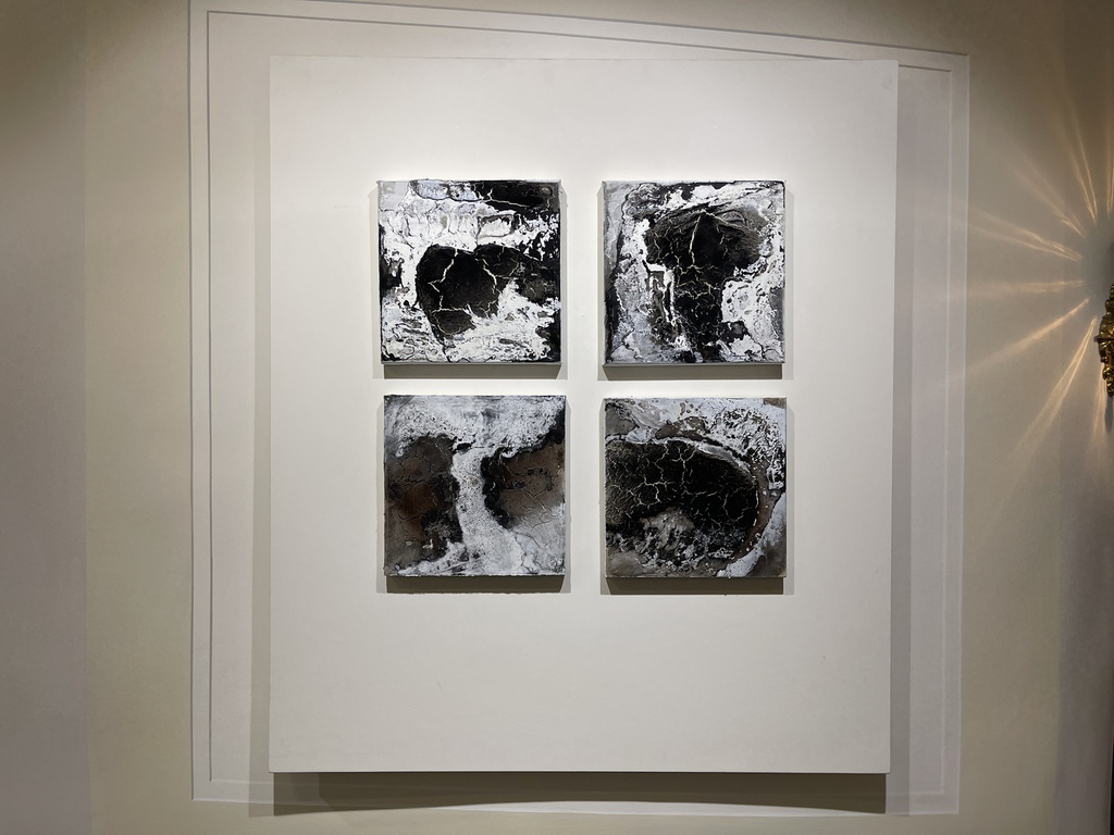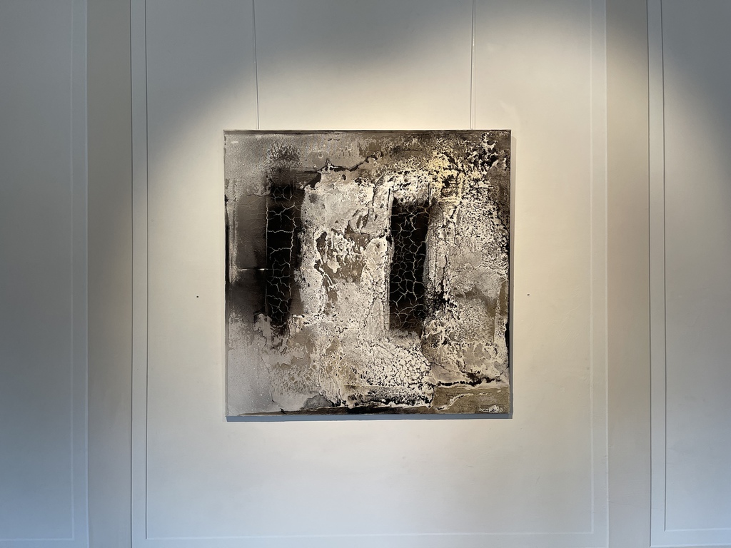 Kein Wunder, denn Walter hält sich passend an die Farben Grau und Braun in sämtlichen Schattierungen. Wer würde da nicht an Erde denken. Wo Rot sichtbar wird, fällt einem das Stichwort Lava ein, bei Grauschwarz ist die Assoziation Gletscher-Geröll. Die Strukturen, Schichtungen, Überlagerungen ergeben Reliefs.