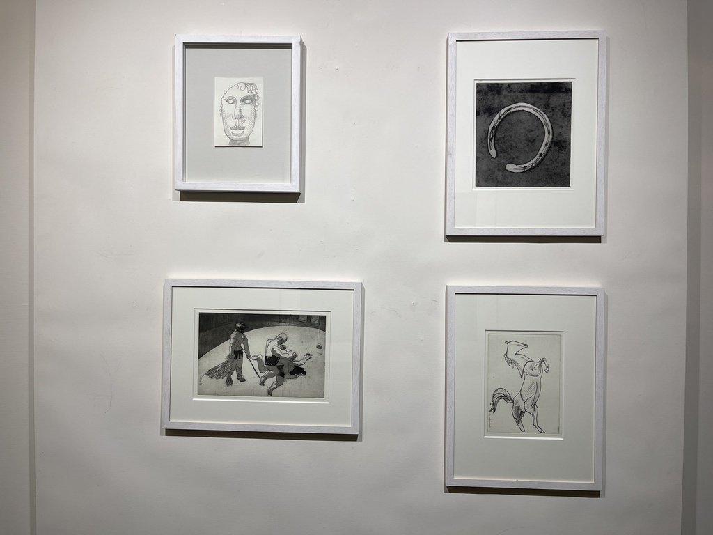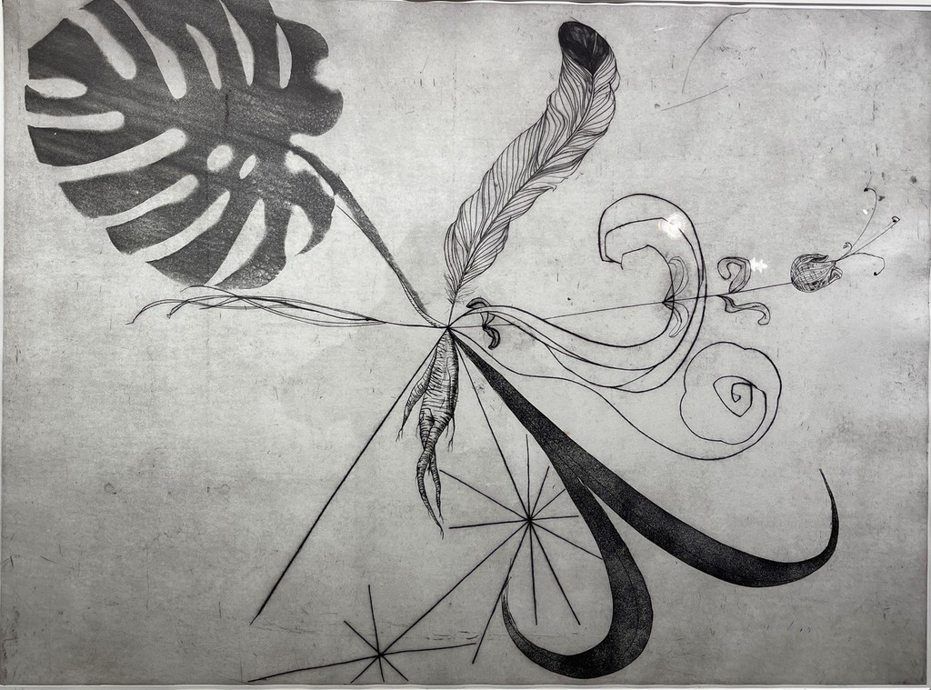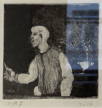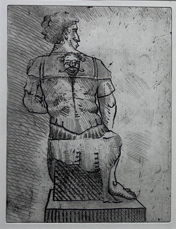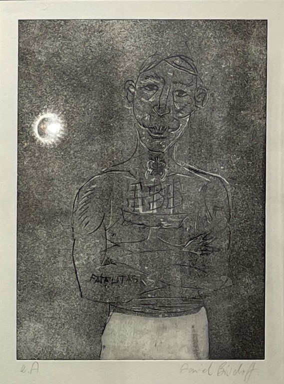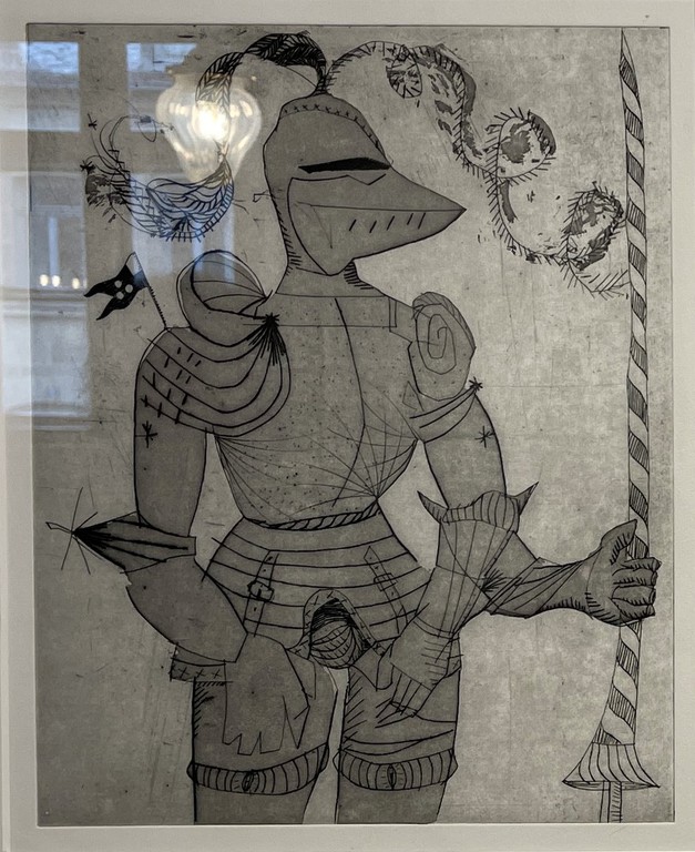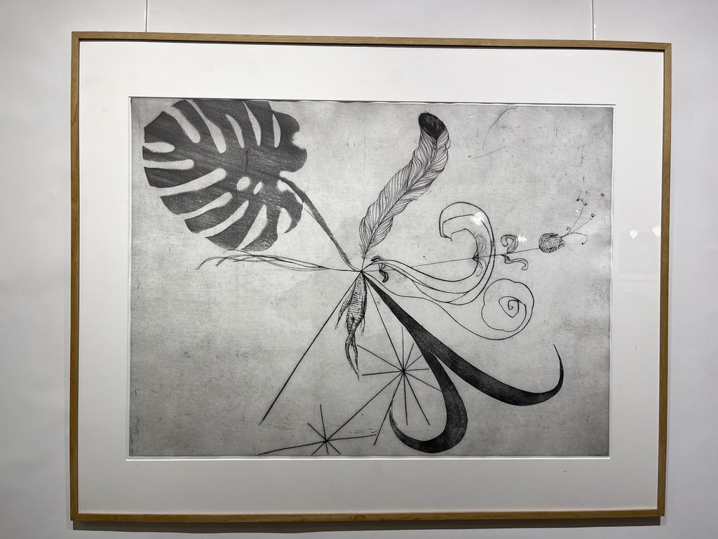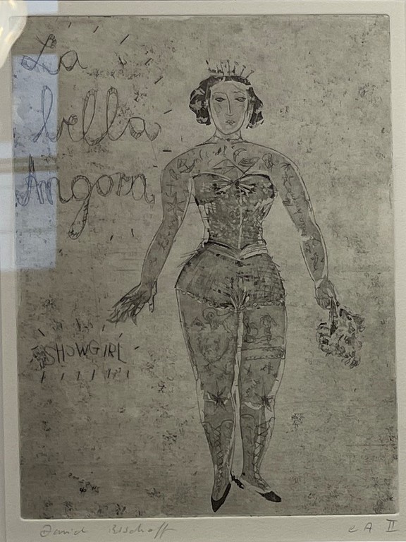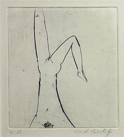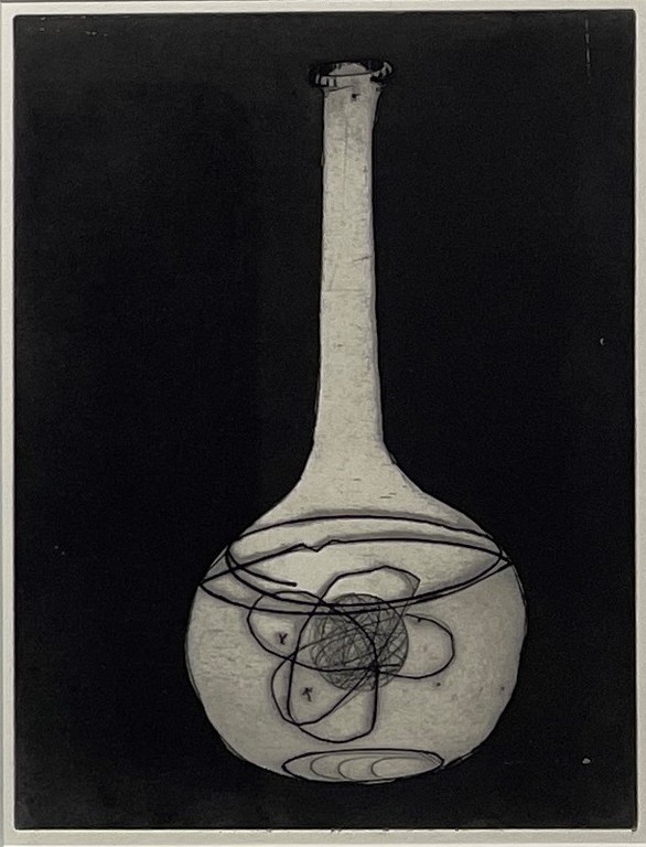 Auch Daniel Bischoff, Jahrgang 1976, wurde an der Akademie in seiner Geburtsstadt Nürnberg ausgebildet. In Tiefdruck auf Bütten präsentiert er Arbeiten, die Formen erforschen. Das Zeichnen ist derzeit augenscheinlich sein Ding: ein Pferd, das sich aufbäumt, ein Showgirl mit Federschmuck am Kopf, ein kopfstehender Körper, der Mann und Frau zugleich ist, aber auch geheimnisvolle Dinge wie ein Flasche mit einem Geist darin oder eine Urne voller Zähne.