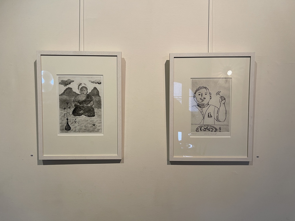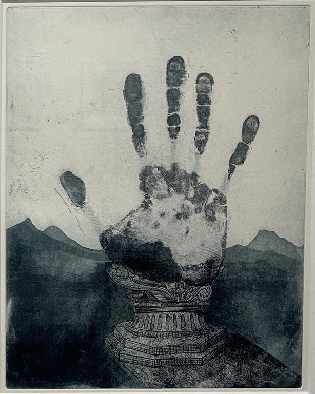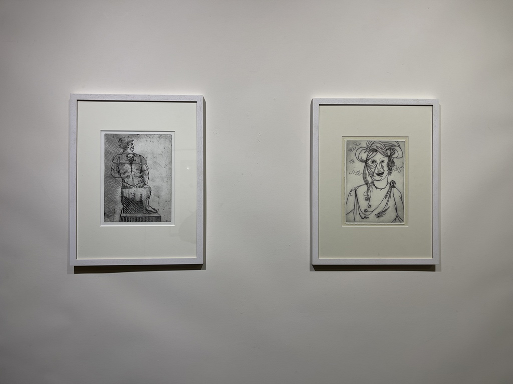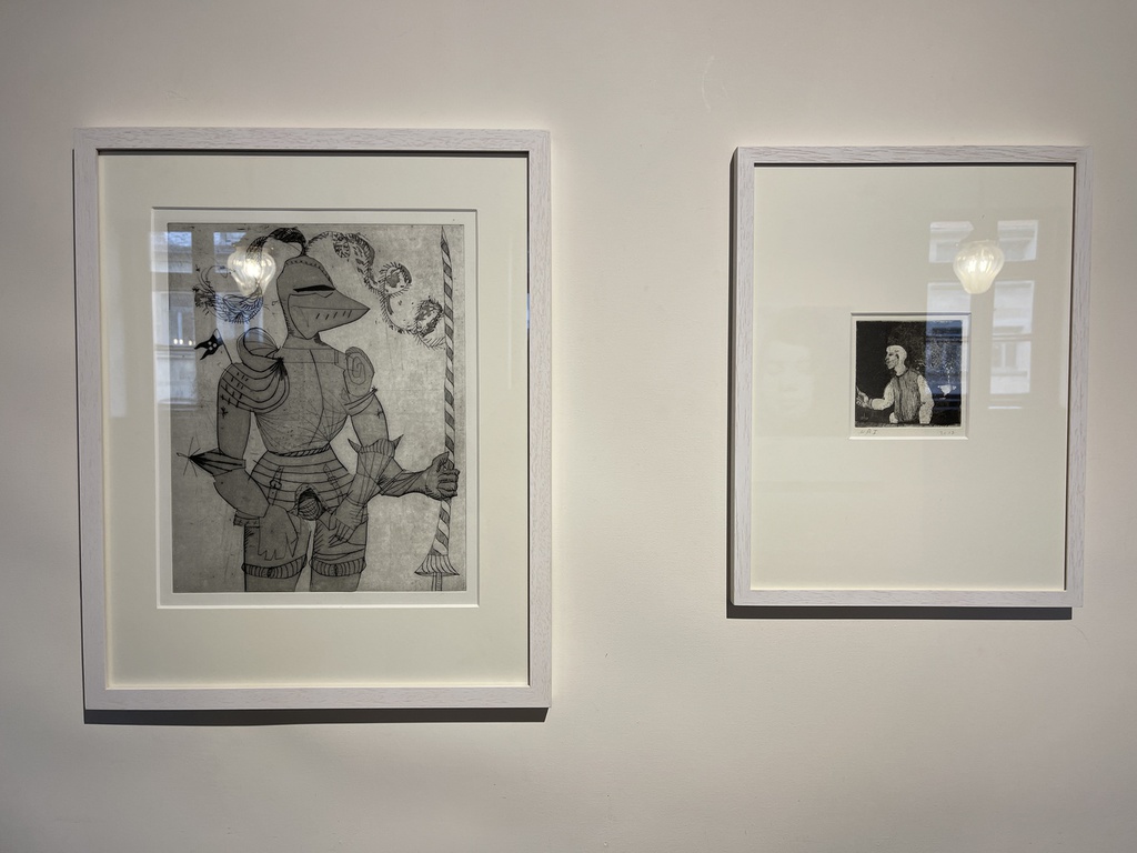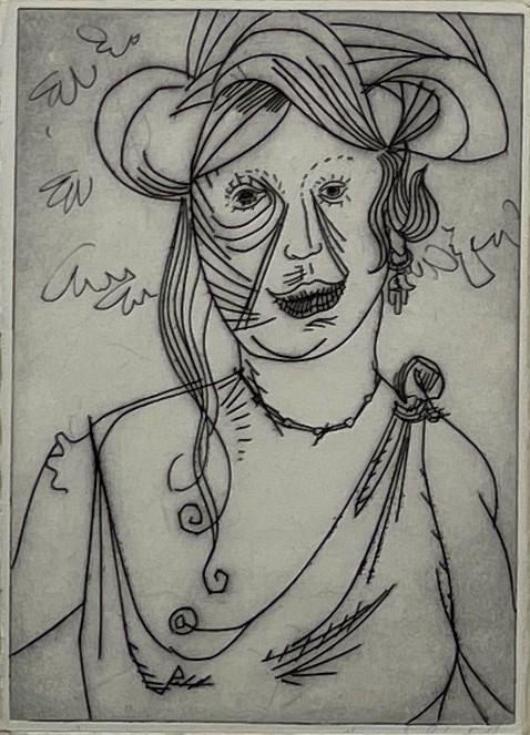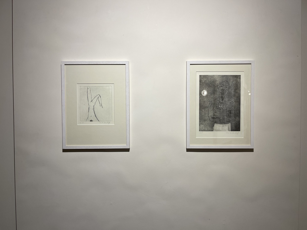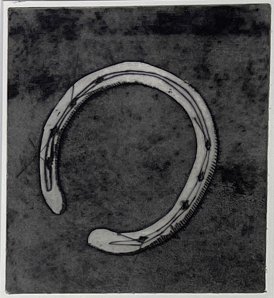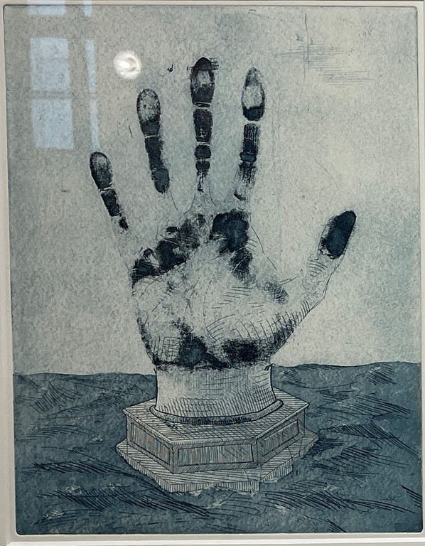 Auch Daniel Bischoff, Jahrgang 1976, wurde an der Akademie in seiner Geburtsstadt Nürnberg ausgebildet. In Tiefdruck auf Bütten präsentiert er Arbeiten, die Formen erforschen. Das Zeichnen ist derzeit augenscheinlich sein Ding: ein Pferd, das sich aufbäumt, ein Showgirl mit Federschmuck am Kopf, ein kopfstehender Körper, der Mann und Frau zugleich ist, aber auch geheimnisvolle Dinge wie ein Flasche mit einem Geist darin oder eine Urne voller Zähne.