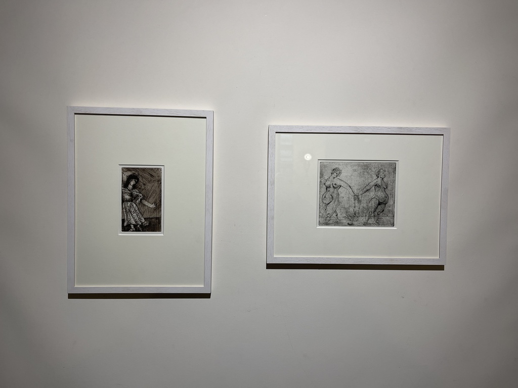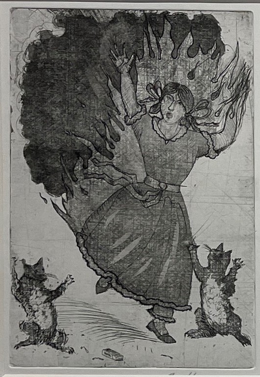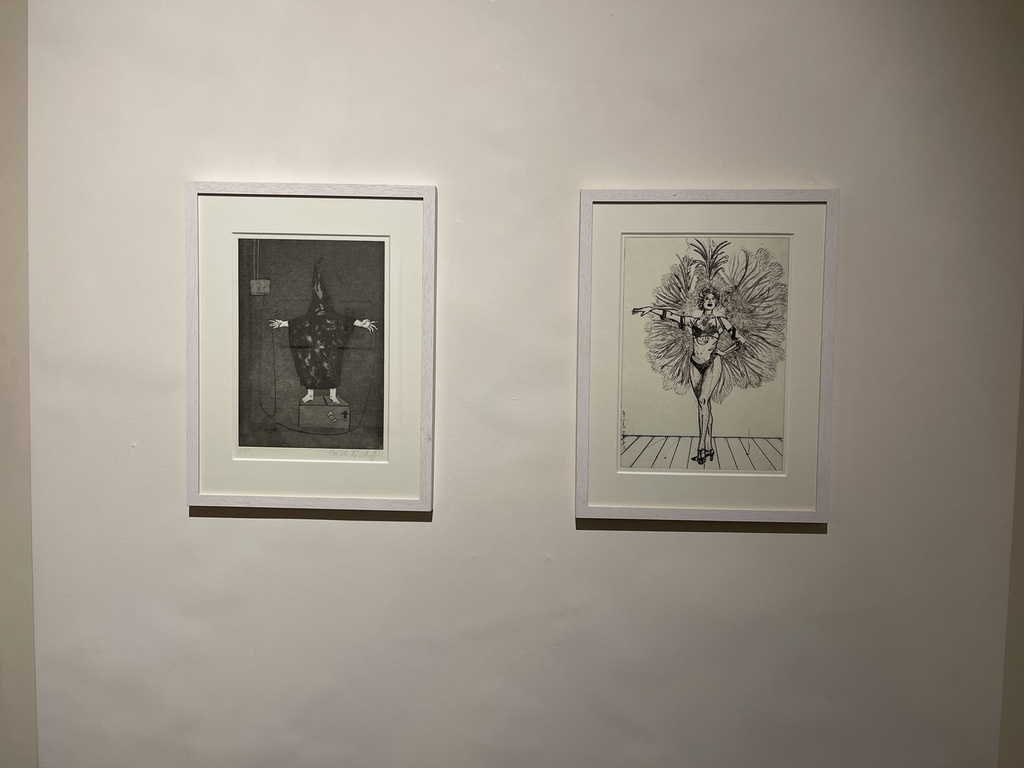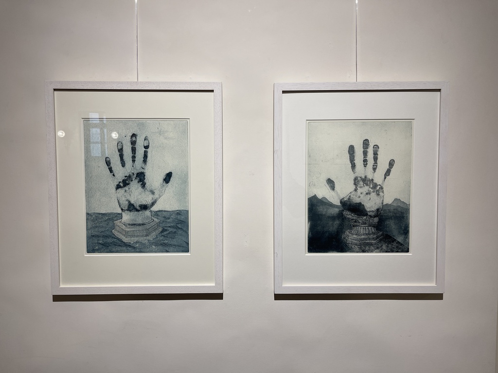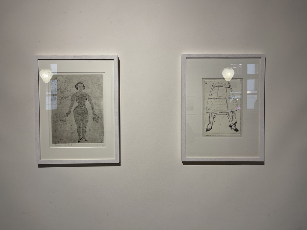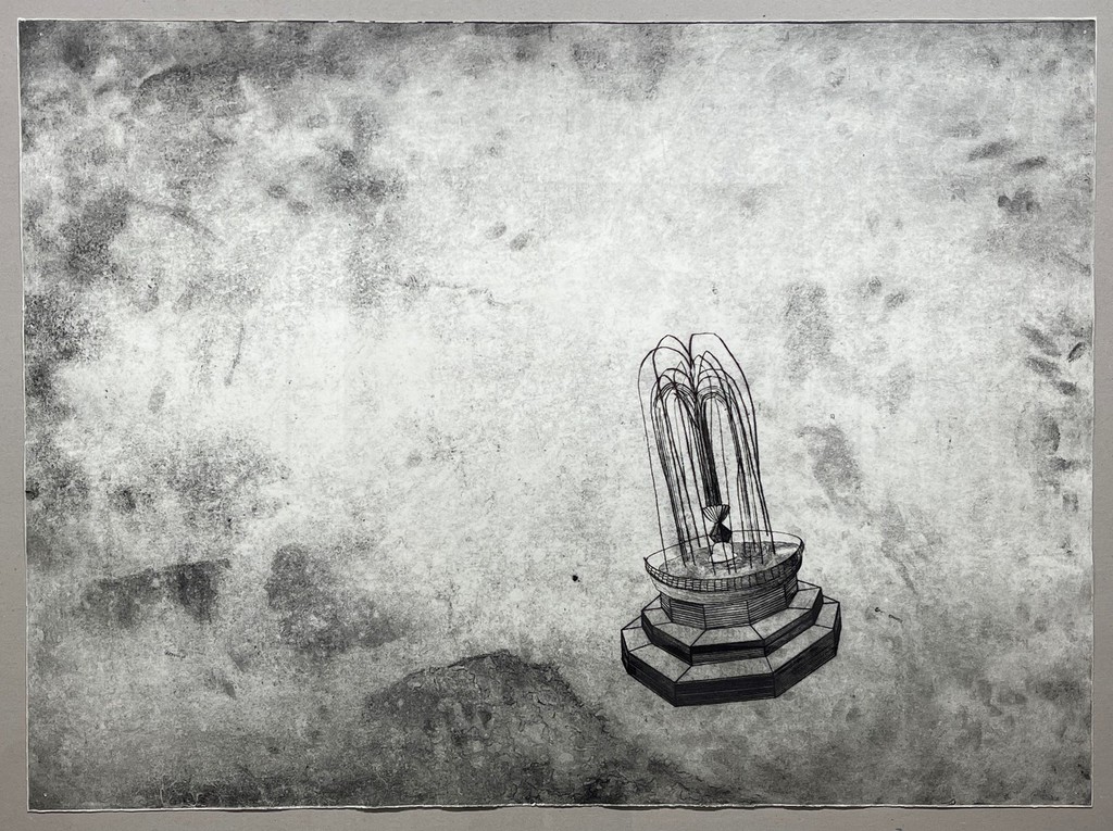 Auch Daniel Bischoff, Jahrgang 1976, wurde an der Akademie in seiner Geburtsstadt Nürnberg ausgebildet. In Tiefdruck auf Bütten präsentiert er Arbeiten, die Formen erforschen. Das Zeichnen ist derzeit augenscheinlich sein Ding: ein Pferd, das sich aufbäumt, ein Showgirl mit Federschmuck am Kopf, ein kopfstehender Körper, der Mann und Frau zugleich ist, aber auch geheimnisvolle Dinge wie ein Flasche mit einem Geist darin oder eine Urne voller Zähne.