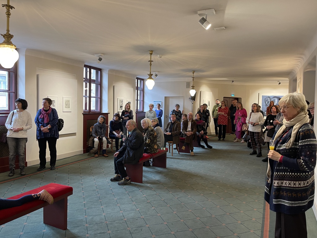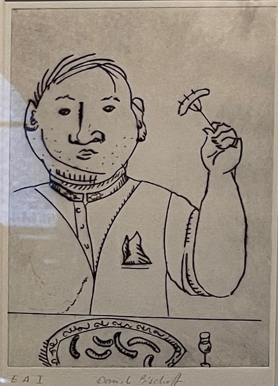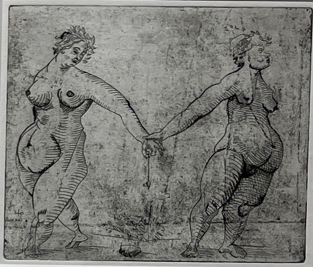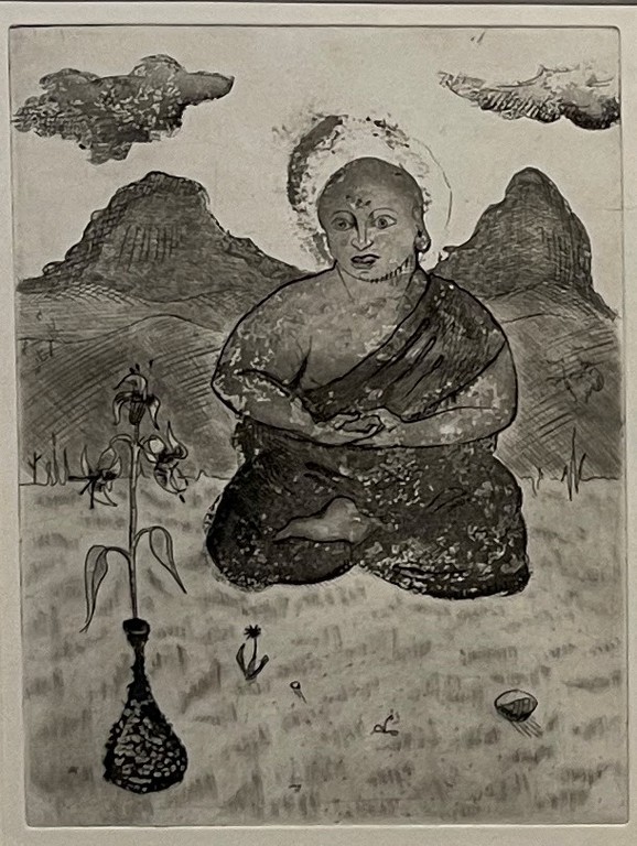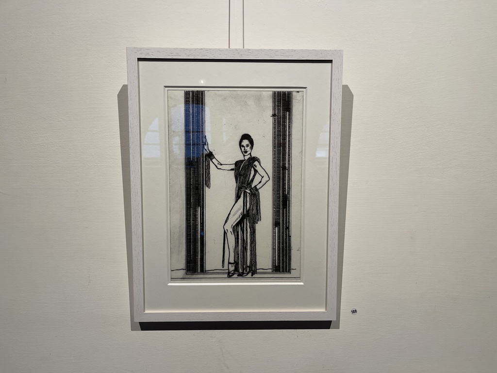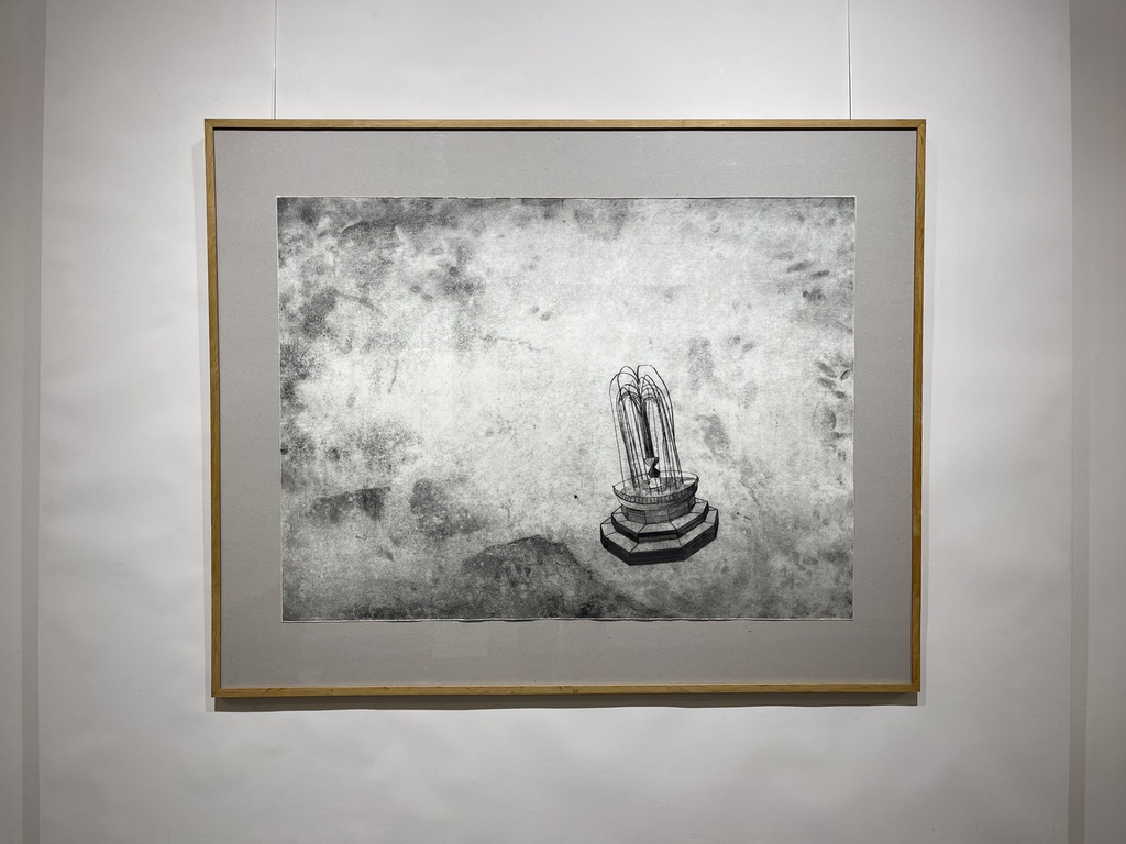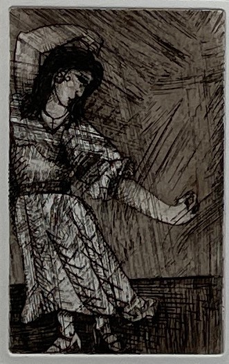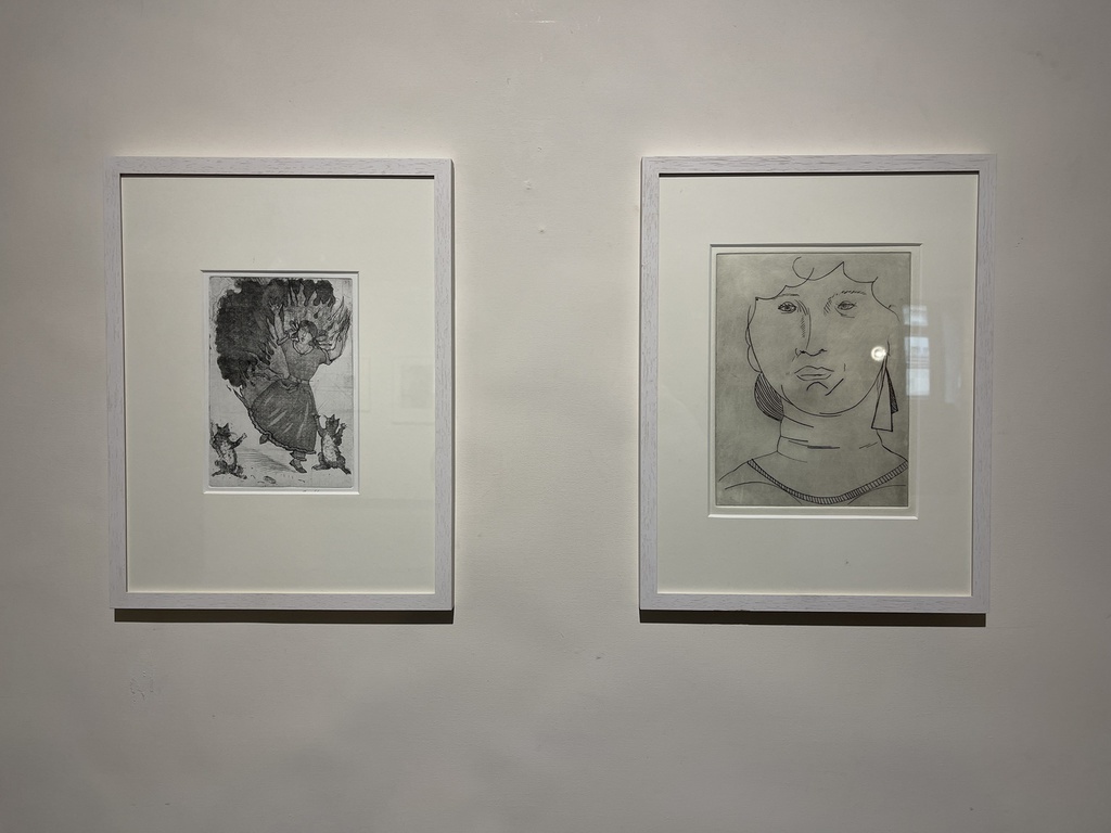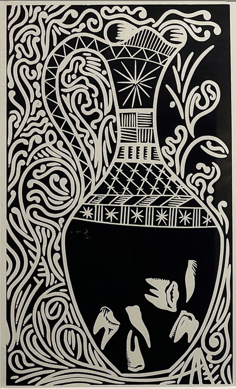 Auch Daniel Bischoff, Jahrgang 1976, wurde an der Akademie in seiner Geburtsstadt Nürnberg ausgebildet. In Tiefdruck auf Bütten präsentiert er Arbeiten, die Formen erforschen. Das Zeichnen ist derzeit augenscheinlich sein Ding: ein Pferd, das sich aufbäumt, ein Showgirl mit Federschmuck am Kopf, ein kopfstehender Körper, der Mann und Frau zugleich ist, aber auch geheimnisvolle Dinge wie ein Flasche mit einem Geist darin oder eine Urne voller Zähne.