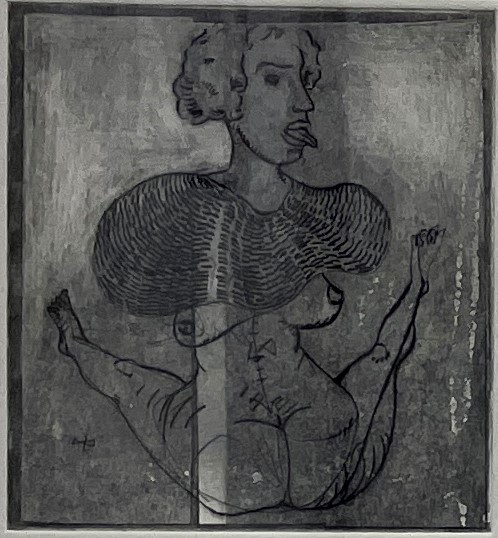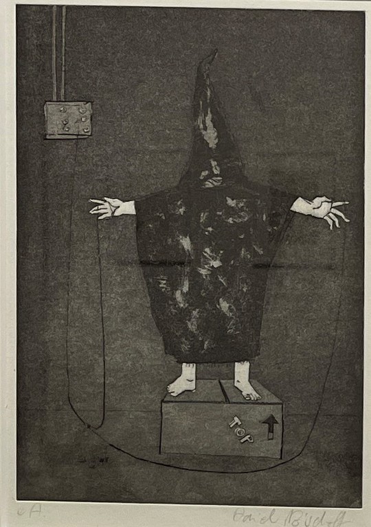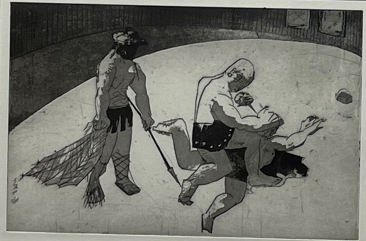 Ganze Szenen hat er ebenfalls kreiert, etwa "Paulinchen", das brennende Mädchen aus dem Struwwelpeter, das eine ausdrucksstarke Kinderbuch-Illustration abgeben würde, oder einen Kampf in der Arena im alten Rom. Politisch wird es mit "Abu Gharaib", das einen gefolterten mit Kaputzenumhang zeigt. Bischoff hat die Motive in die Druckunterage eingetieft und dann abgezogen, wobei er weitgehend auf Farbe verzichtet, was skizzenhaft anmutet. Lustvoll testet er, was alles mit den Konturen möglich ist, spielt mit seinen Figuren, um zu sehen, wie weit sie tragen oder sich verändern lassen.
