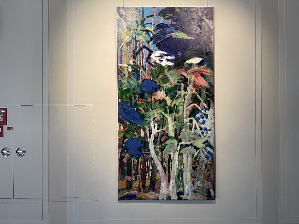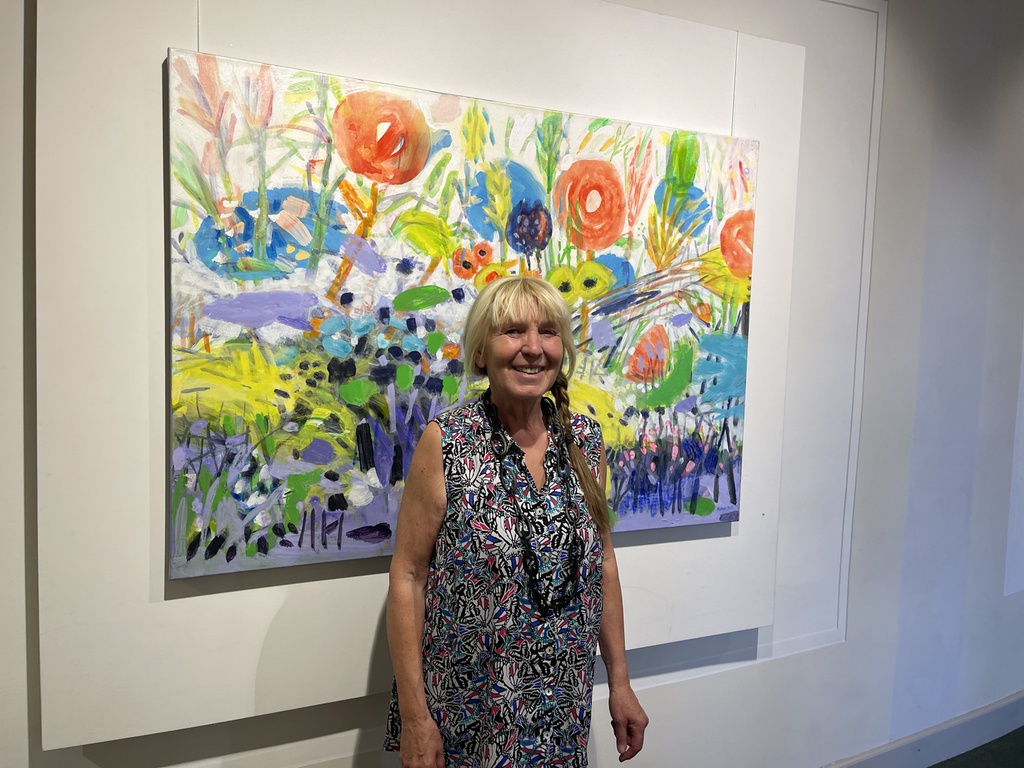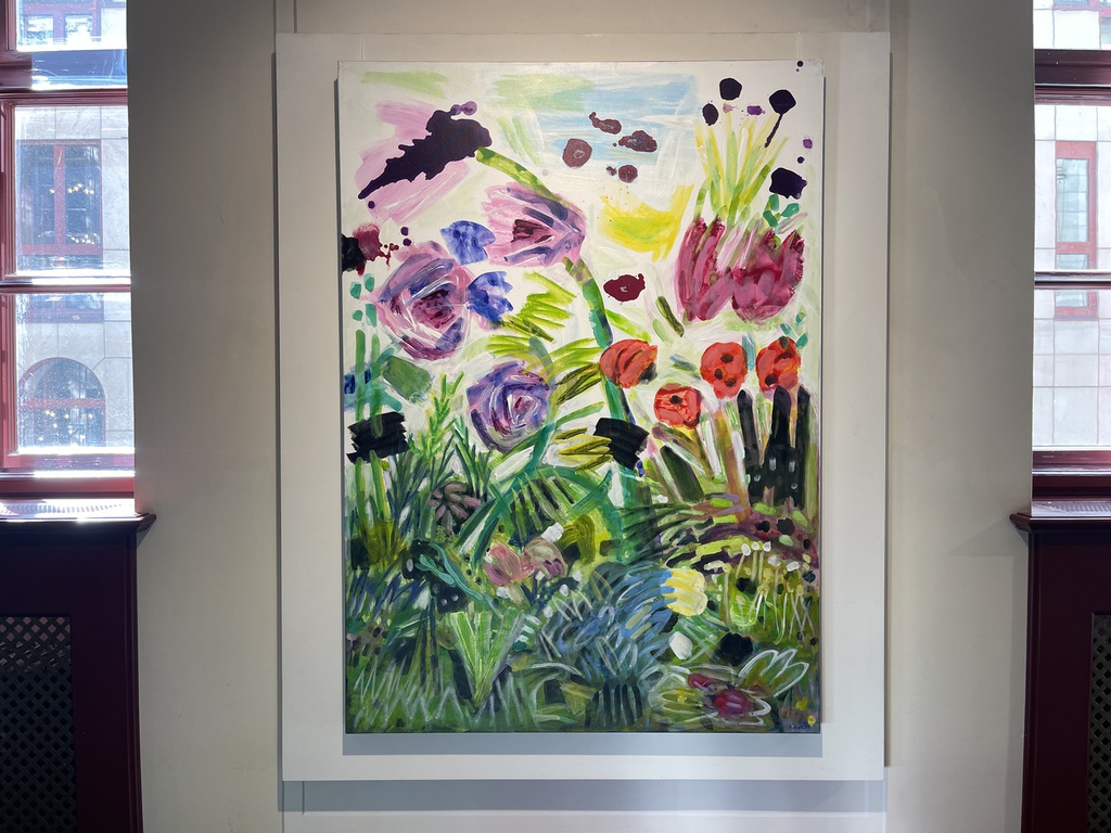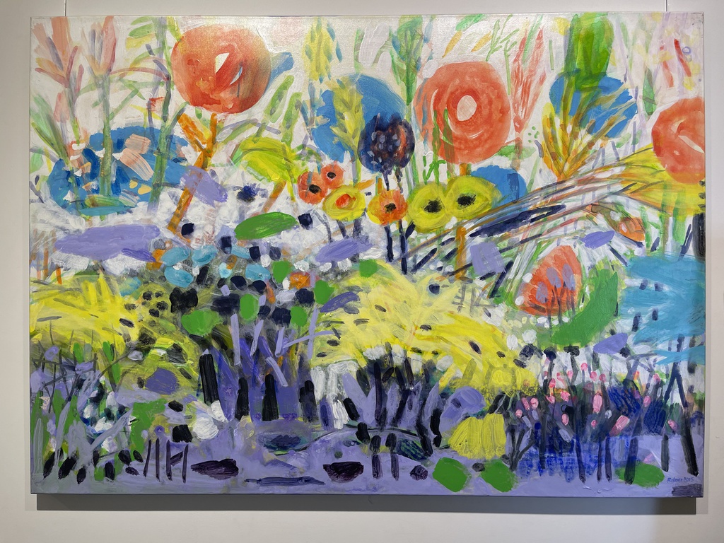 Perspektive, den bunte Blütenklecksen und den übereinanderliegenden Farblinien etwas Kindliches ausstrahlt.