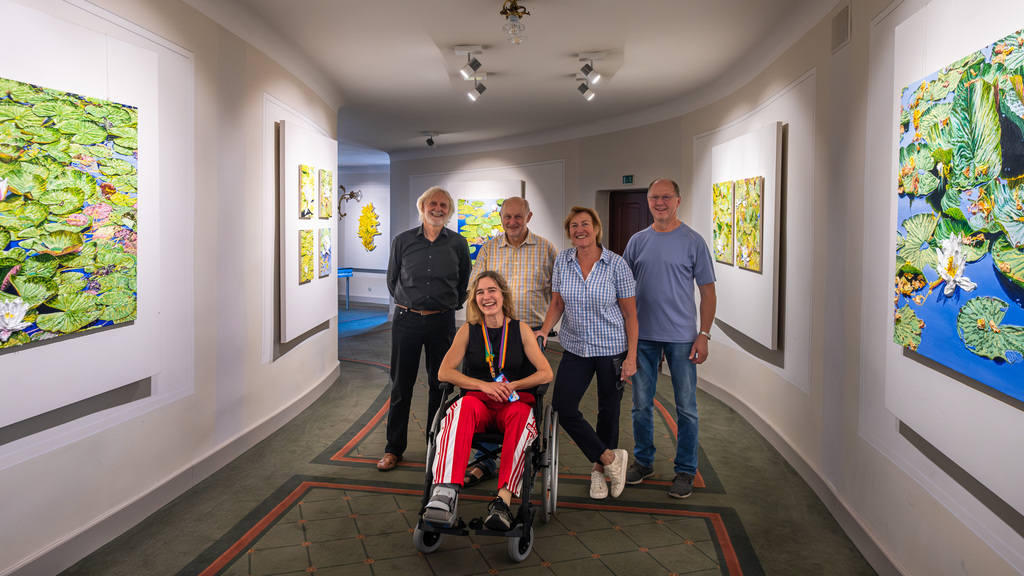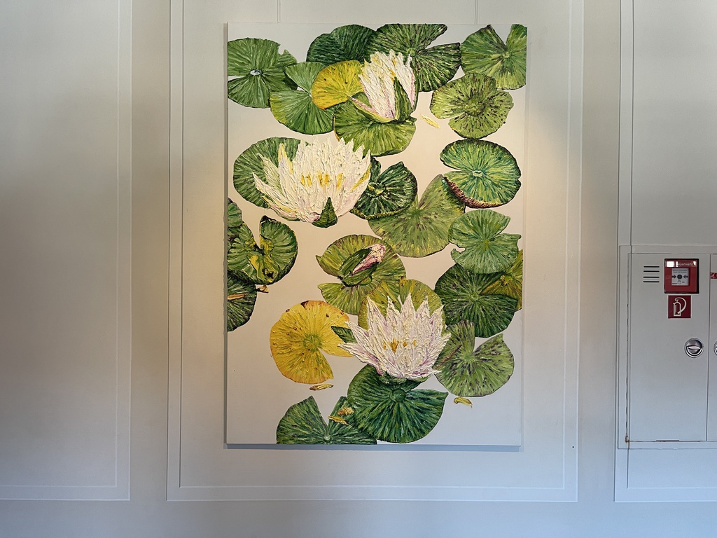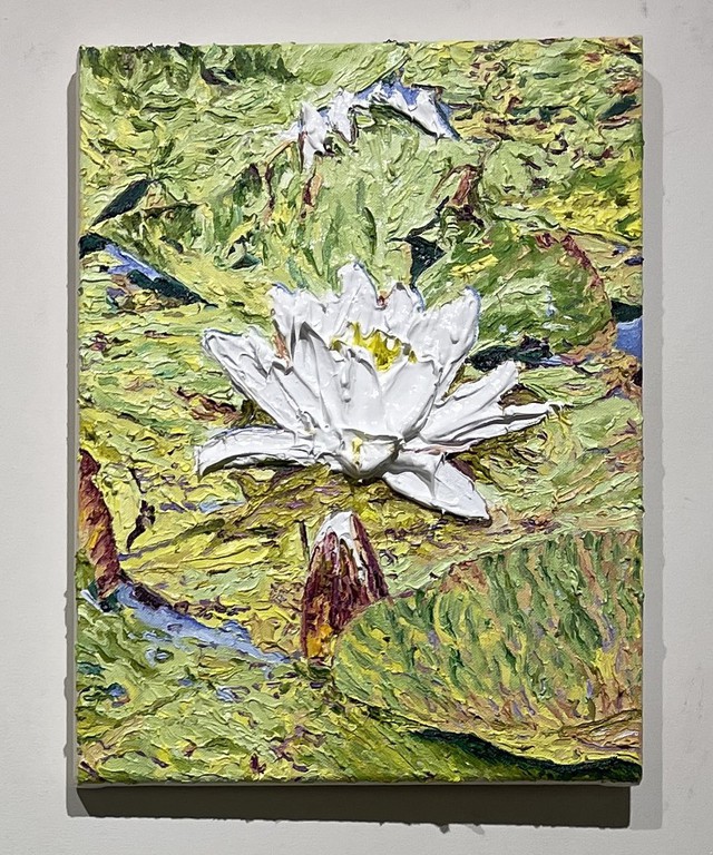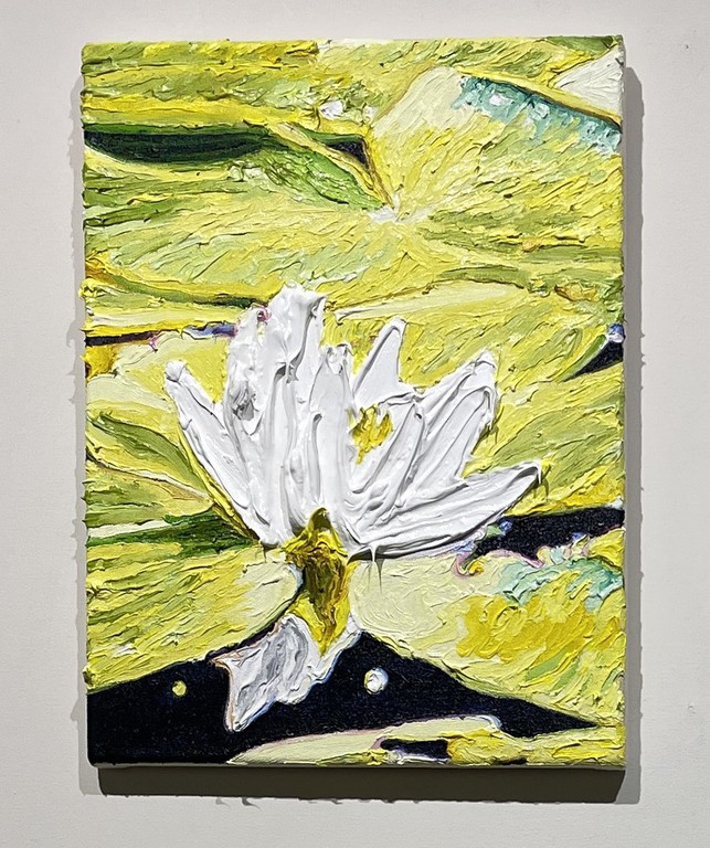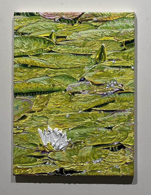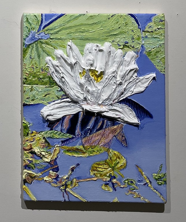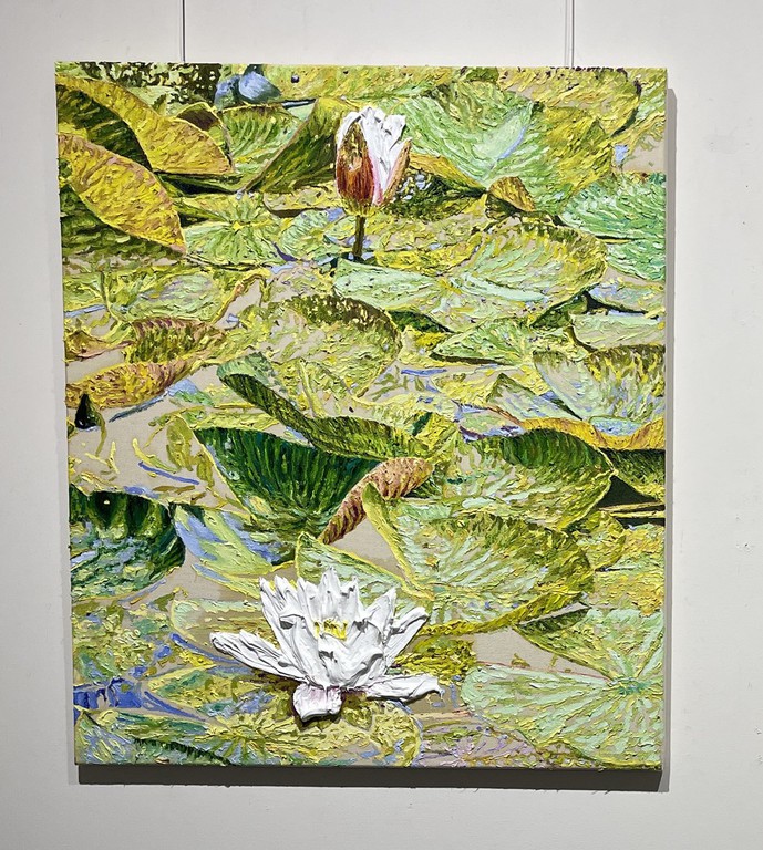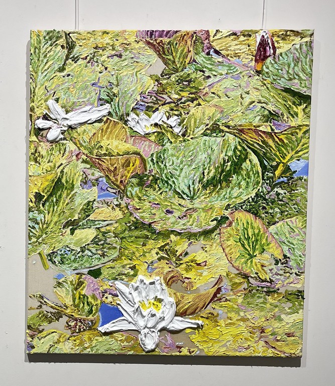 Während Pistner ihren Arbeiten bewusst keine Tiefe gibt, nähert sich die Würzburgerin Katharina Gierlach im Bild der Skulptur an. So nutzt sie bei ihrer Seerosen-Serie die Ölfarbe beinahe wie plastisches Material, so dick aufgetragen, dass die Blütenblätter reliefartig hervortreten. Noch stärker wird dieser Eindruck beim Bild einer Moorlilie. Hier ist die Form der Blume ausgeschnitten, fehlt der Hintergrund völlig, so dass die Pflanze zum Gemälde wird, das auch als Skulptur durchgehen könnte.