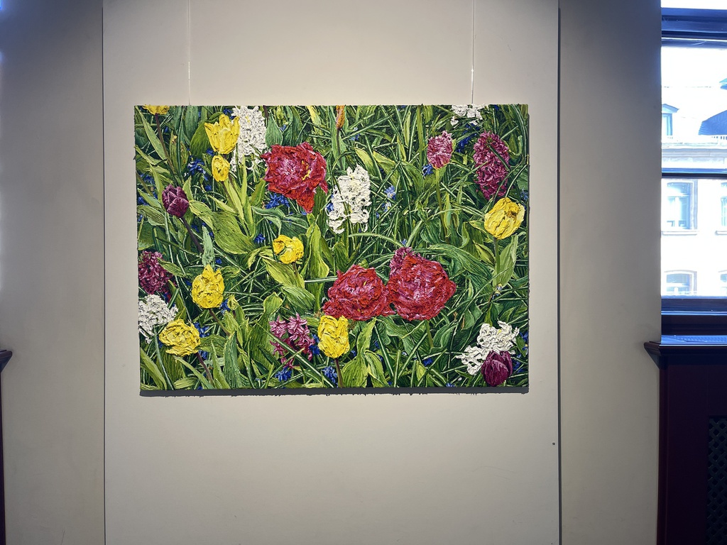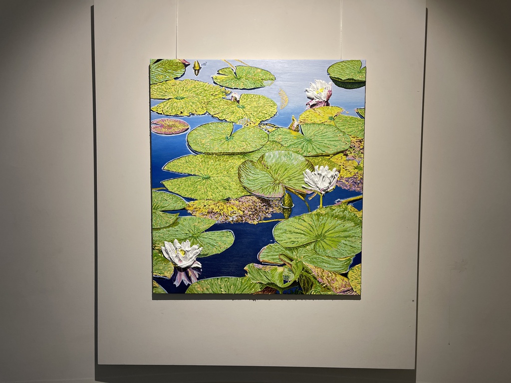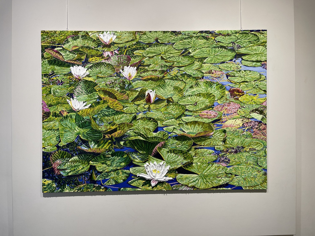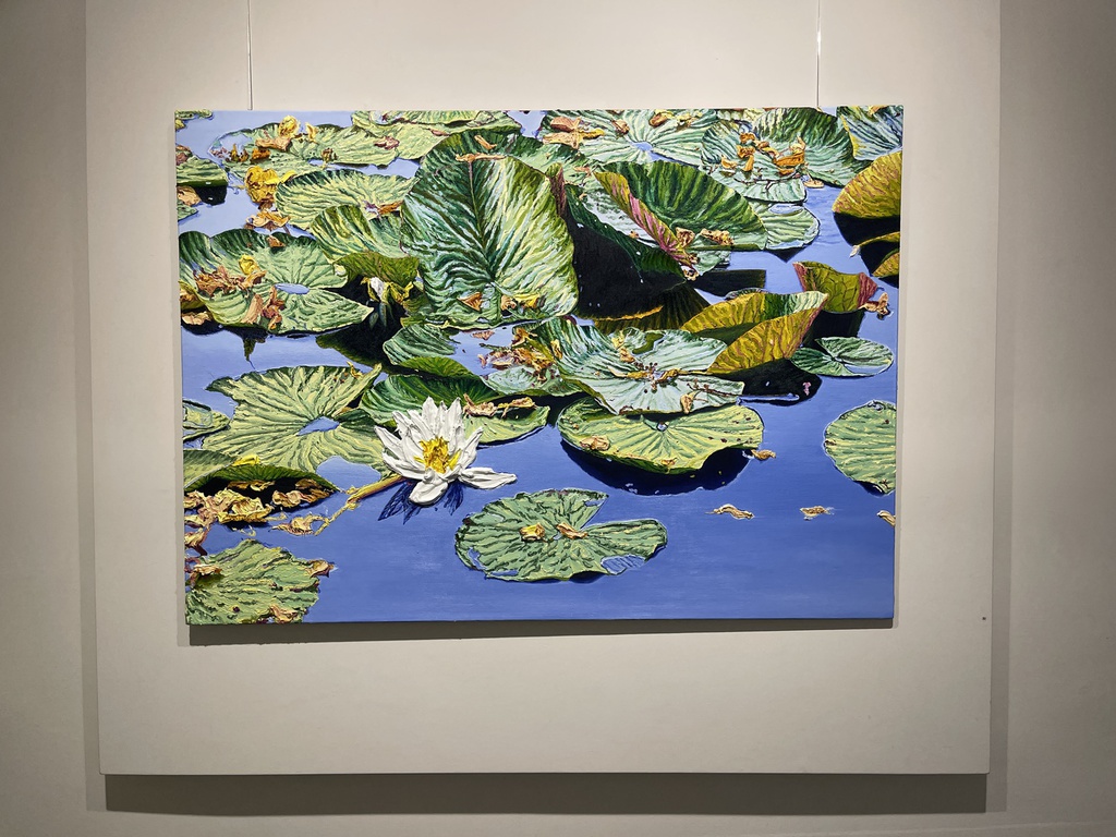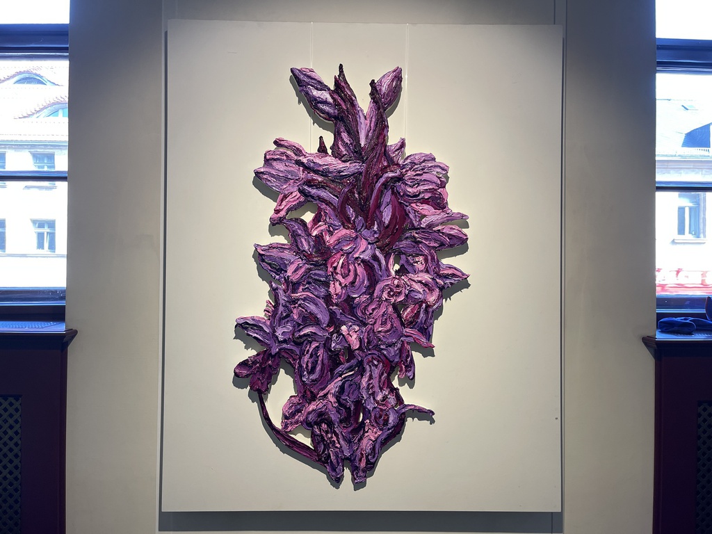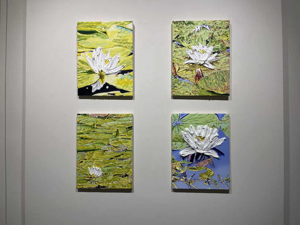 Während Pistner ihren Arbeiten bewusst keine Tiefe gibt, nähert sich die Würzburgerin Katharina Gierlach im Bild der Skulptur an. So nutzt sie bei ihrer Seerosen-Serie die Ölfarbe beinahe wie plastisches Material, so dick aufgetragen, dass die Blütenblätter reliefartig hervortreten. Noch stärker wird dieser Eindruck beim Bild einer Moorlilie. Hier ist die Form der Blume ausgeschnitten, fehlt der Hintergrund völlig, so dass die Pflanze zum Gemälde wird, das auch als Skulptur durchgehen könnte.